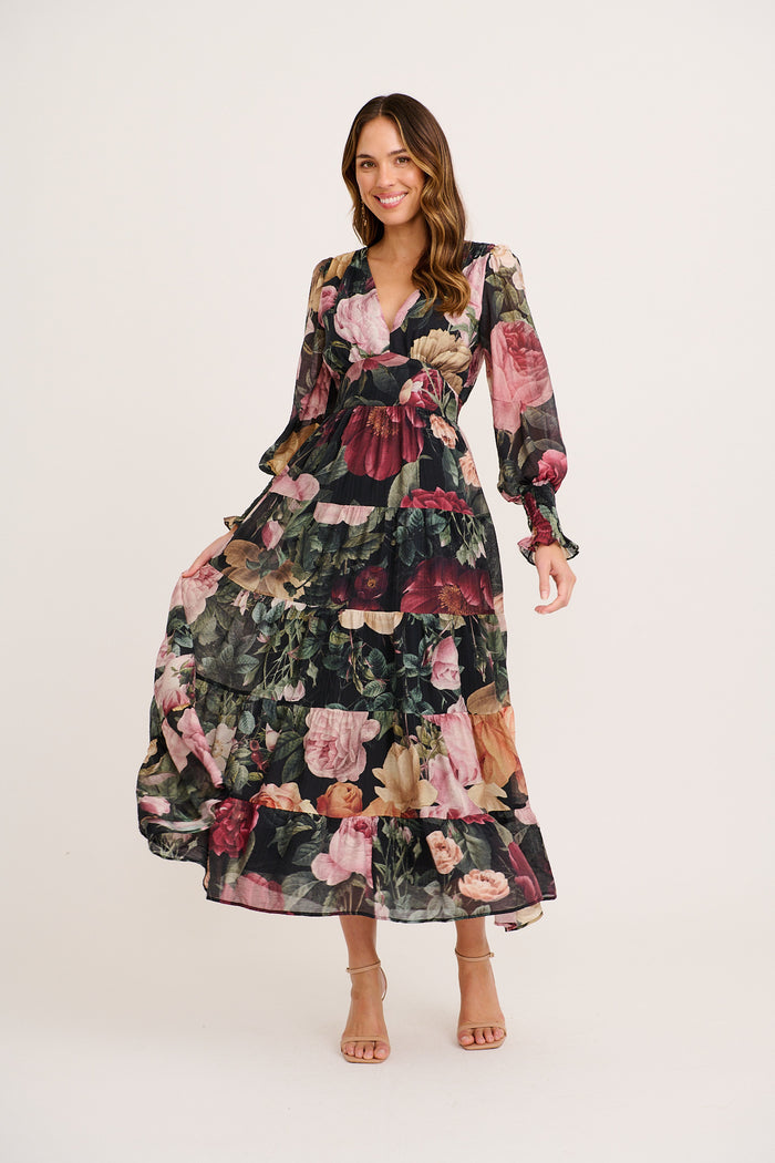 Martina Maxi Dress in Burgundy and Cream Floral Chiffon