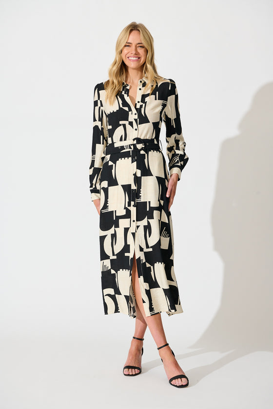 Abbie Midi Shirt Dress in Cream and Black Geometric Print