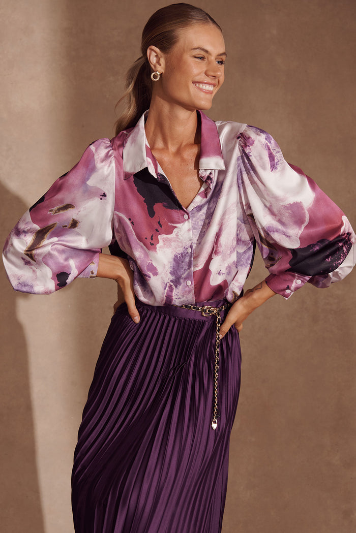 Afternoon Shirt In Pink With Purple Watercolour Satin