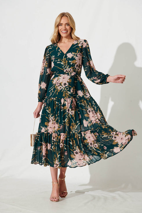 Alexis Maxi Dress In Emerald With Pink Floral Chiffon