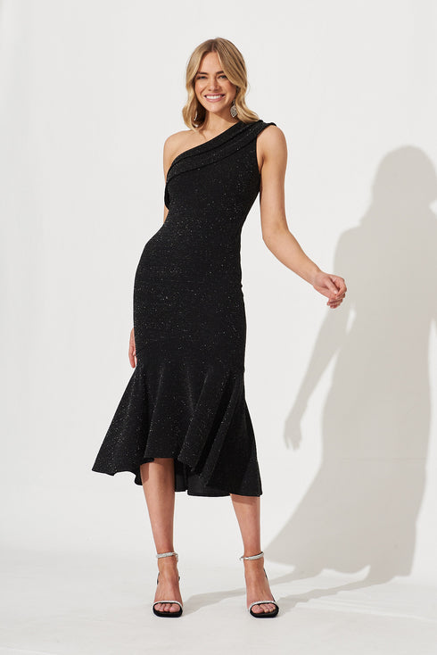 Alina One Shoulder Midi Dress In Black Glitter
