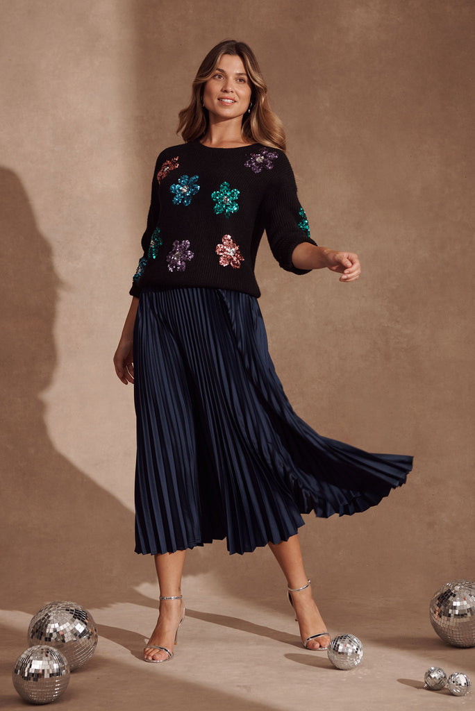 Allison Midi Pleat Skirt In Navy Satin