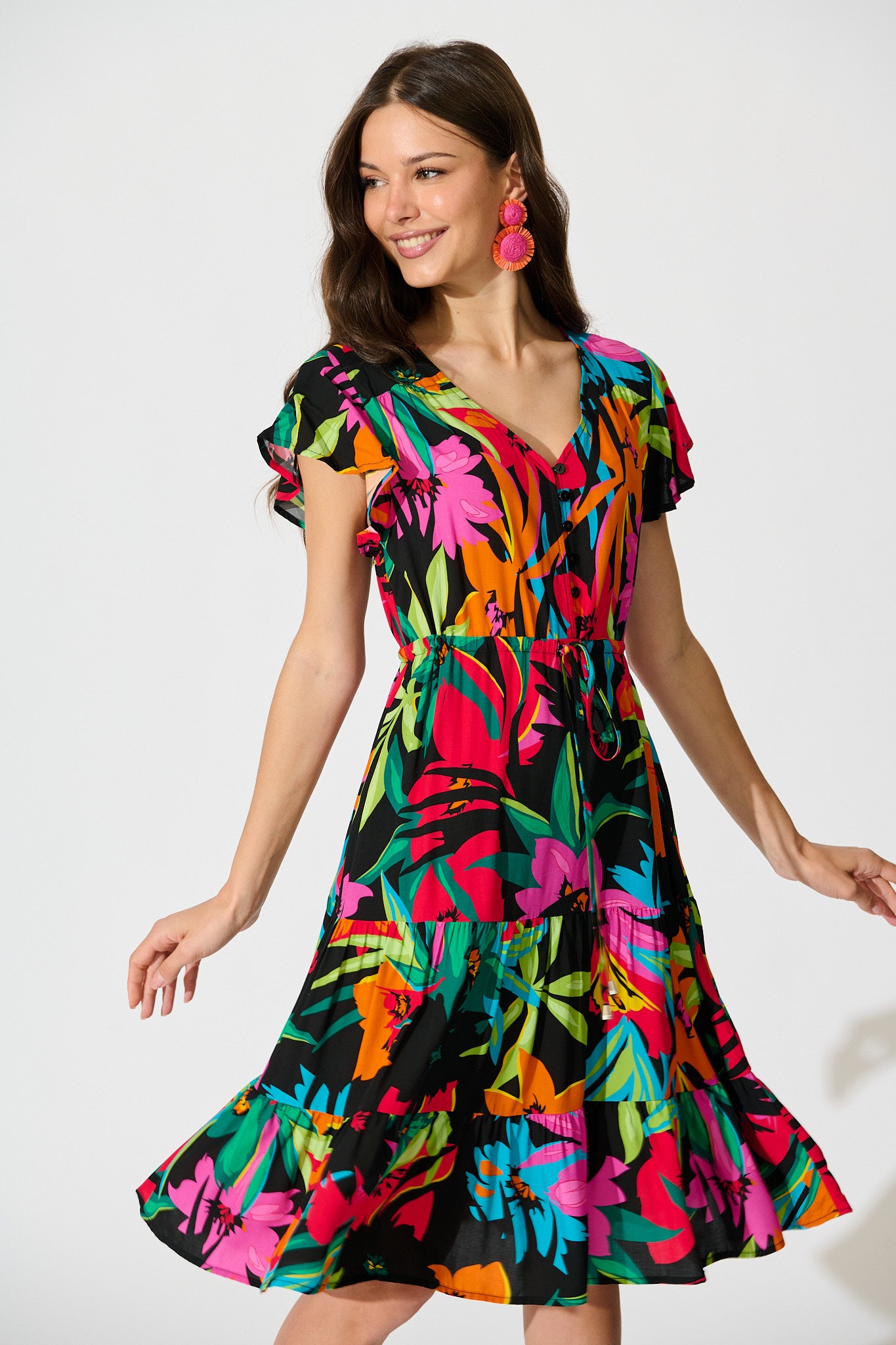 Constructed from breathable rayon, this dress features a v neckline, plastic buttons with elastic loops, a draw‑string waist tie with silver toggle for shaping and functional side pockets. The tiered above‑knee skirt adds movement while the rich multi floral print brings expressive style.