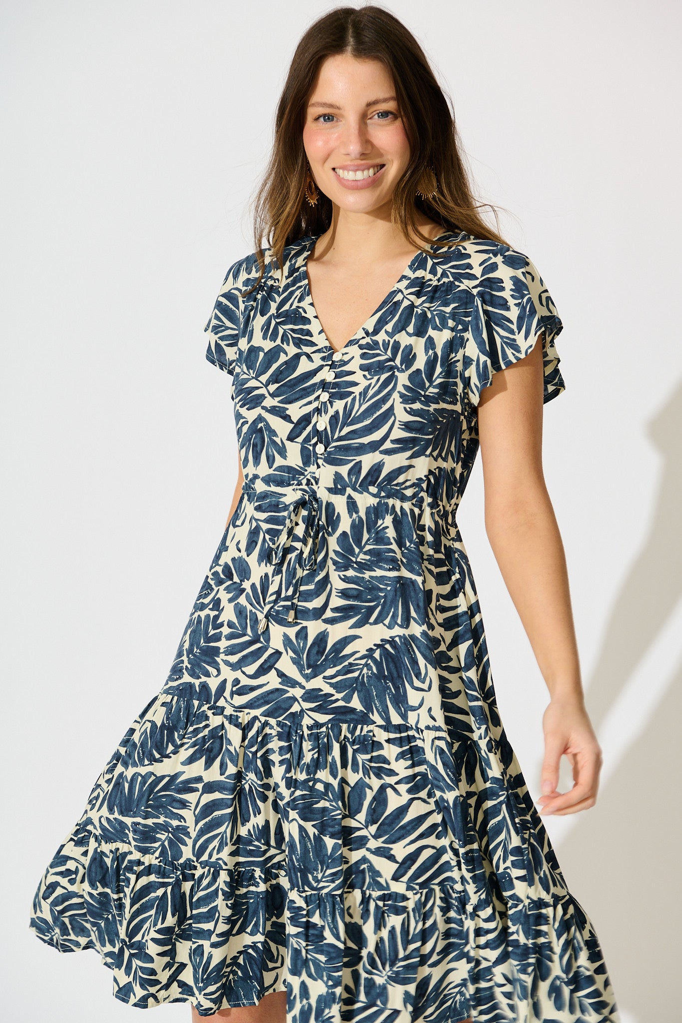 The Allyza Dress in Navy and Cream Leaf Print is an everyday go-to with a soft, tropical feel. Featuring a leafy print and flattering fit, it’s ideal for sunny strolls, weekend getaways or everyday errands.