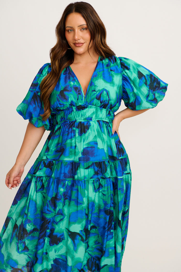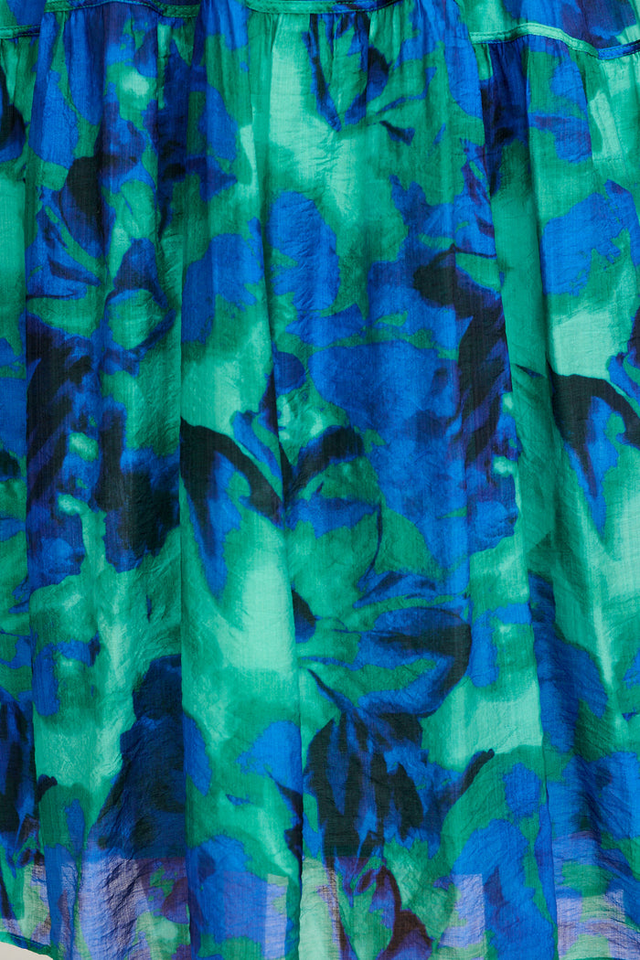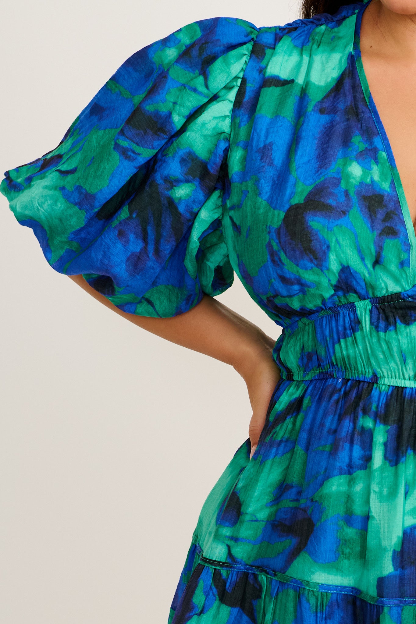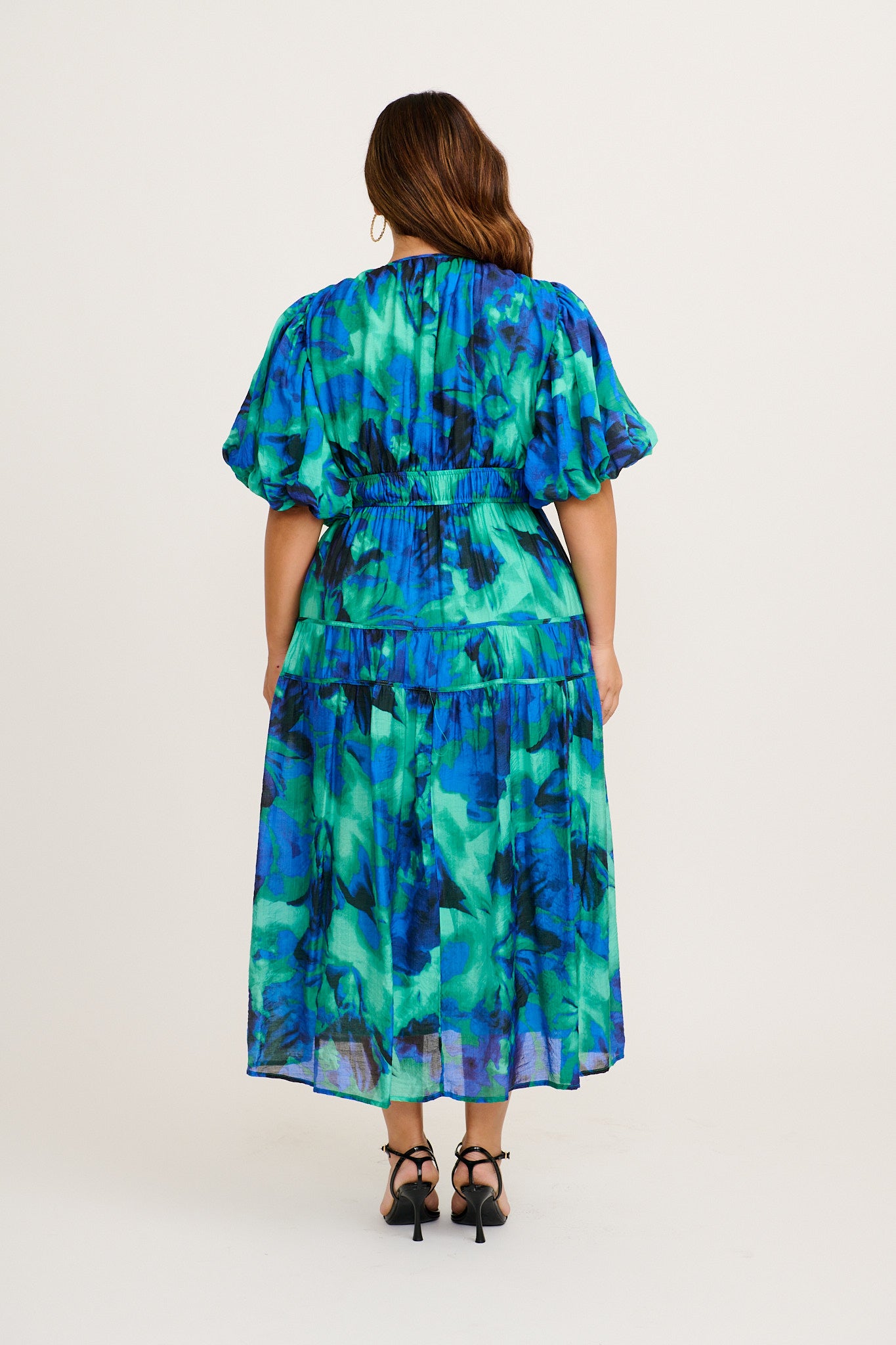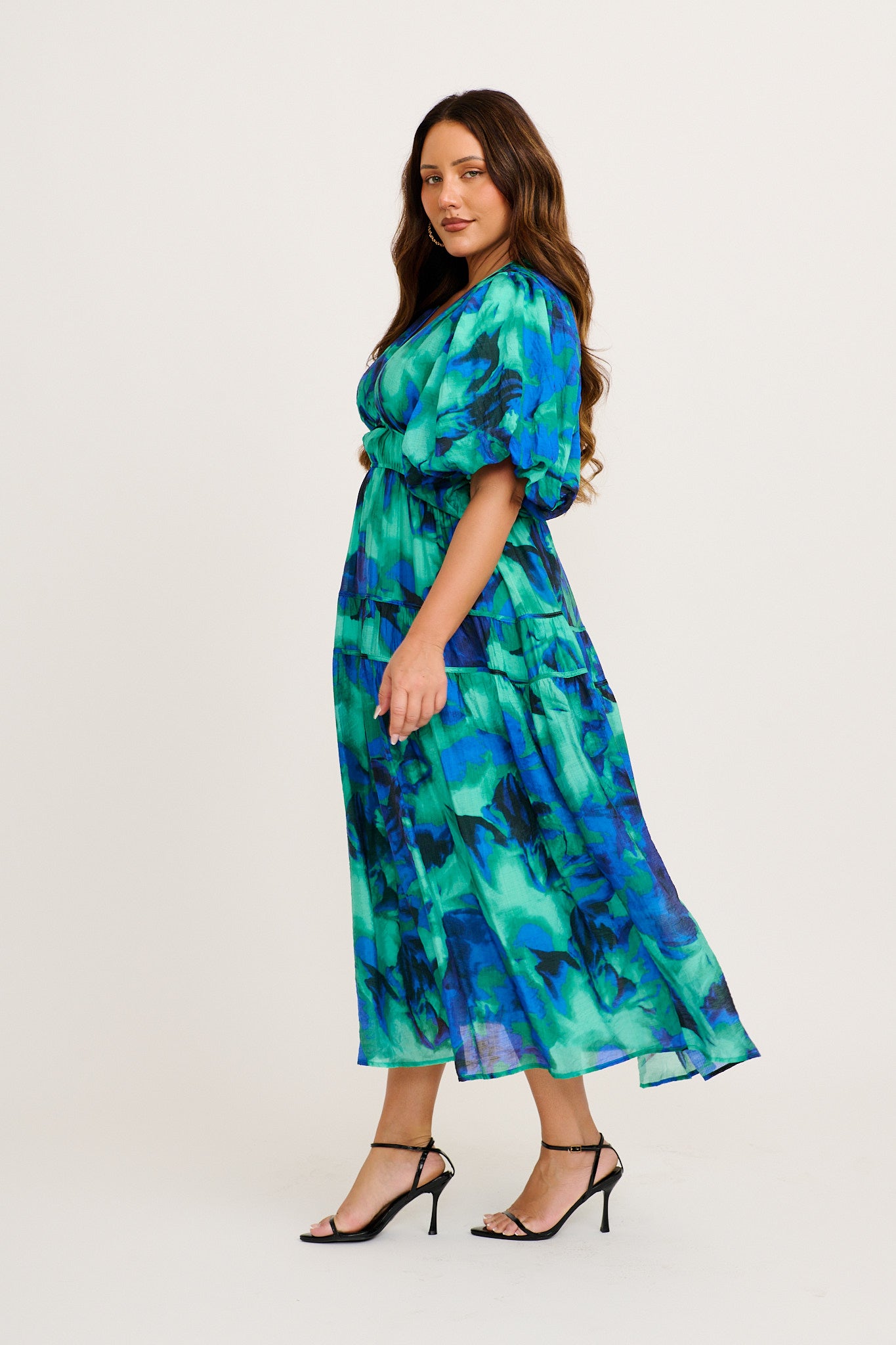 Amalie Midi Dress in Blue and Green Watercolour Print