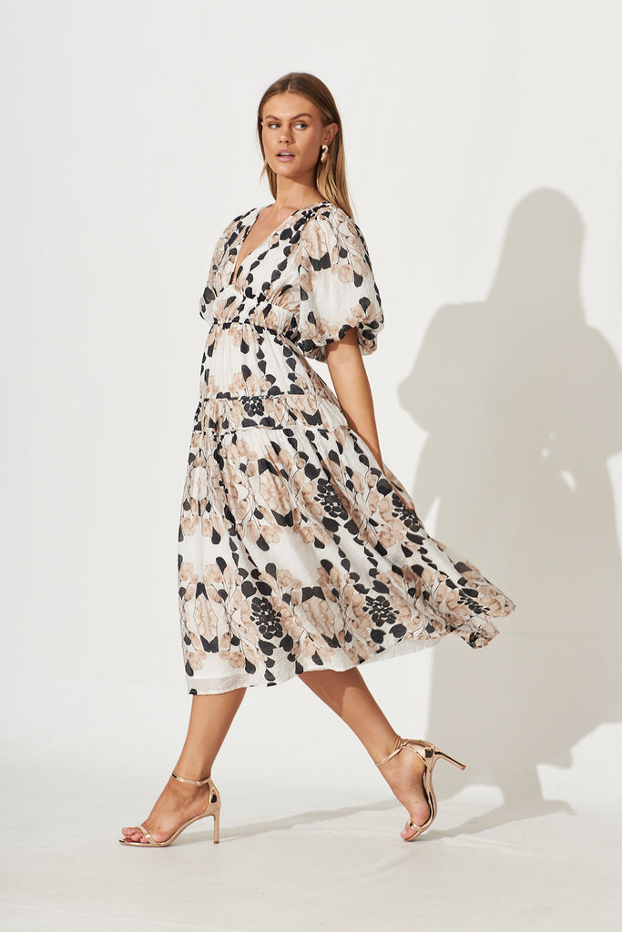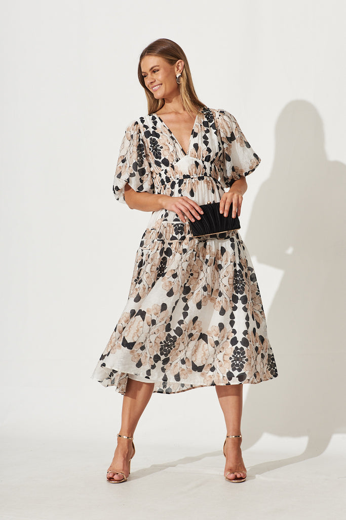 Amalie Midi Dress In Brown Leaf Print