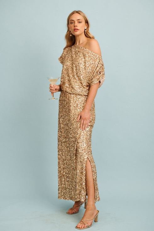 Sparkle and shine, in our Amiri Off Shoulder Maxi Dress this party season. Made from a sequin embellished fabrication, features include off the shoulder neckline, front split hem and a pull on silhouette. Team with your metallic heels and matching purse for a chic look.