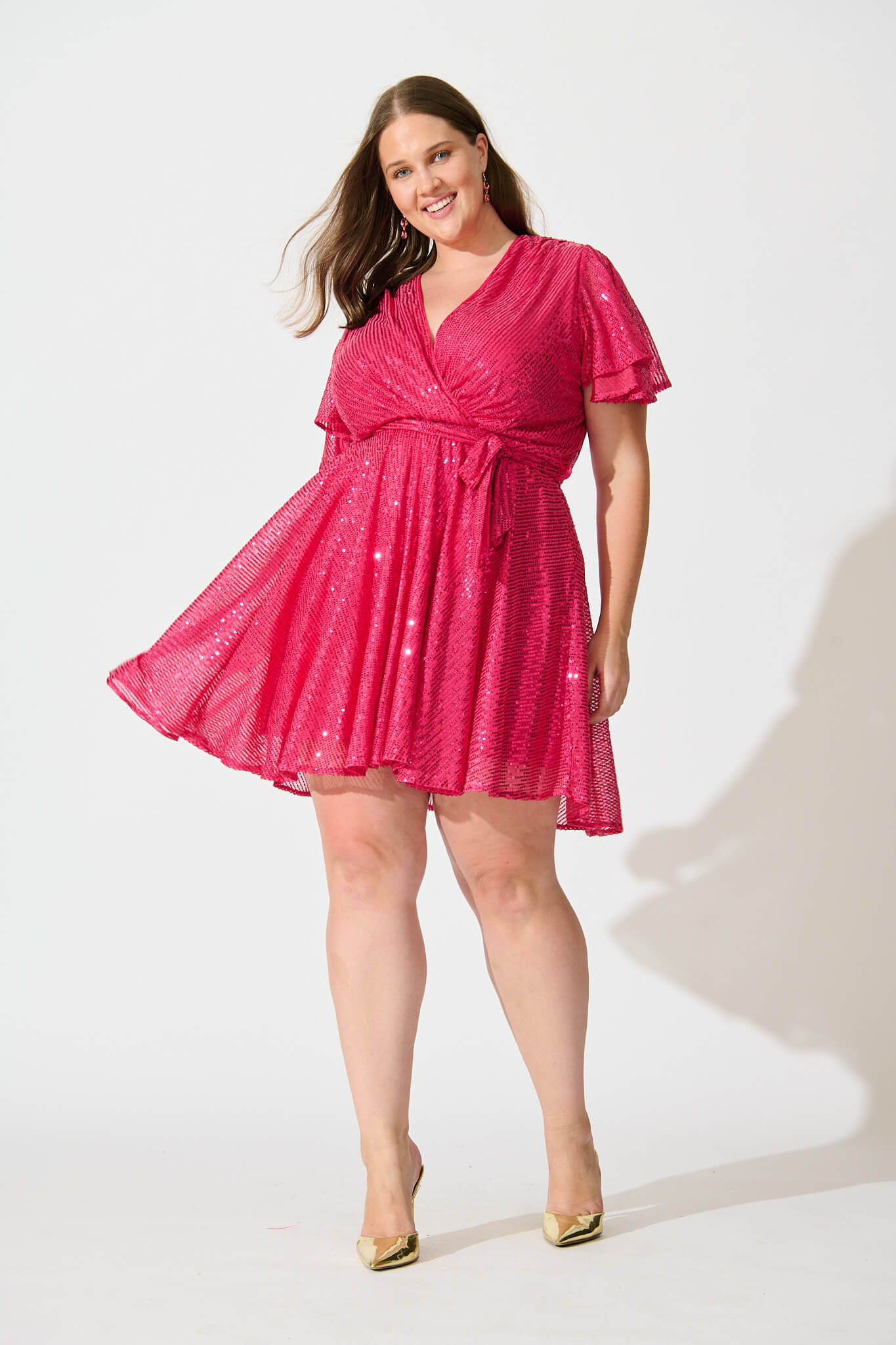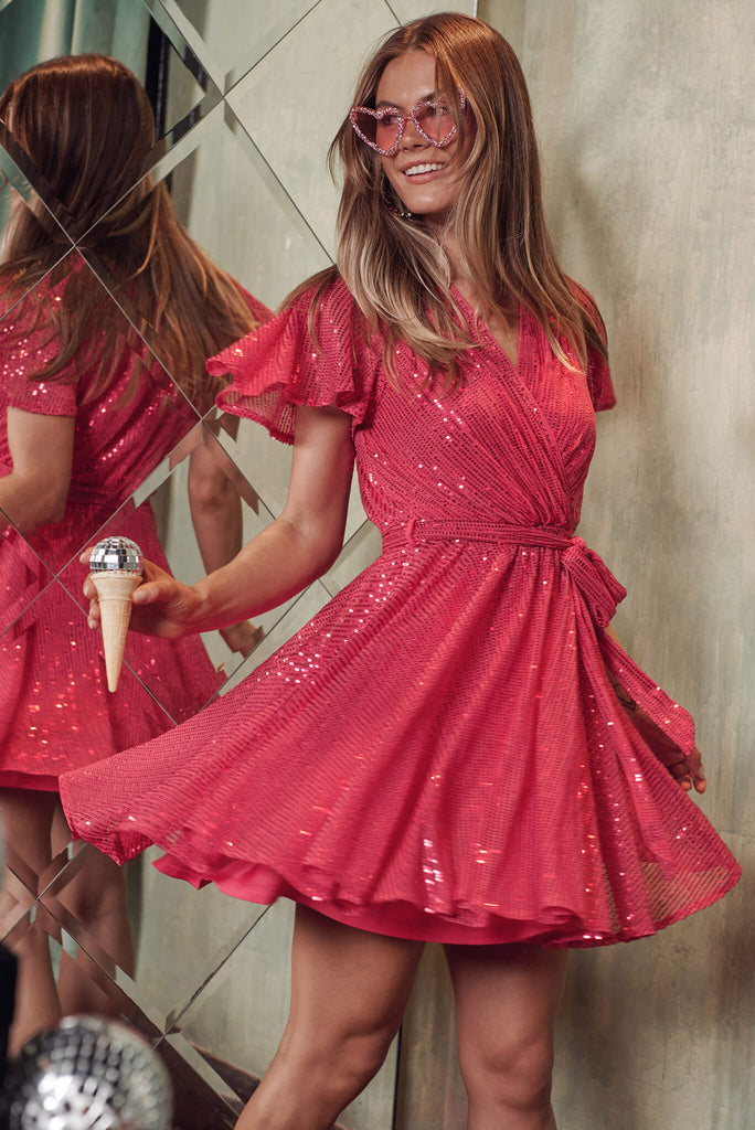 Our Amoretto Dress will slot seamlessly into your party wardrobe with its bold colour and sparkly sequins! The wrap style is super flattering so you can feel comfortable while you dance the night away! Just add statement earrings and stilettos to finish your look!
