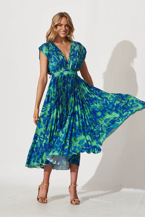 Anetta Midi Dress In Green And Blue Watercolour Satin