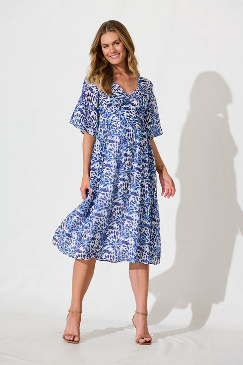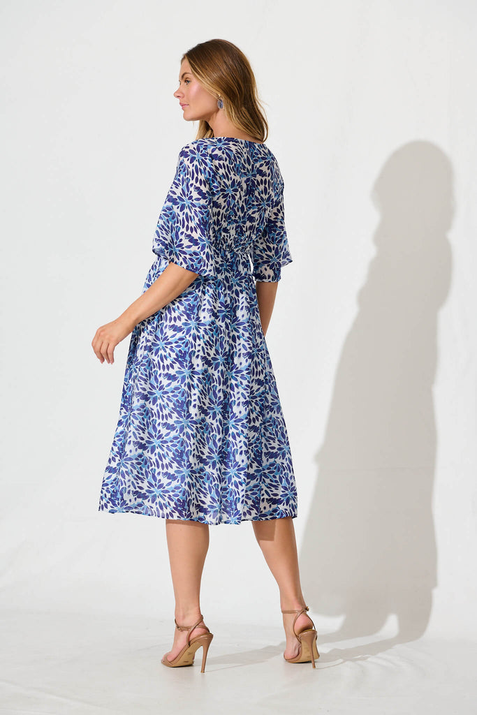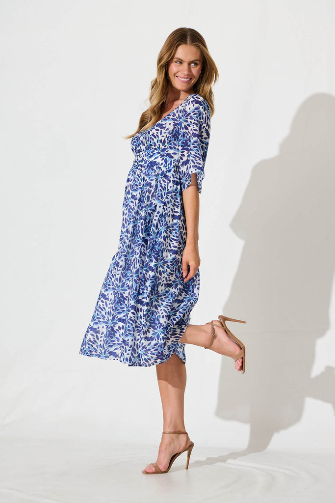 Angie Midi Dress In Blue With Navy Floral Print