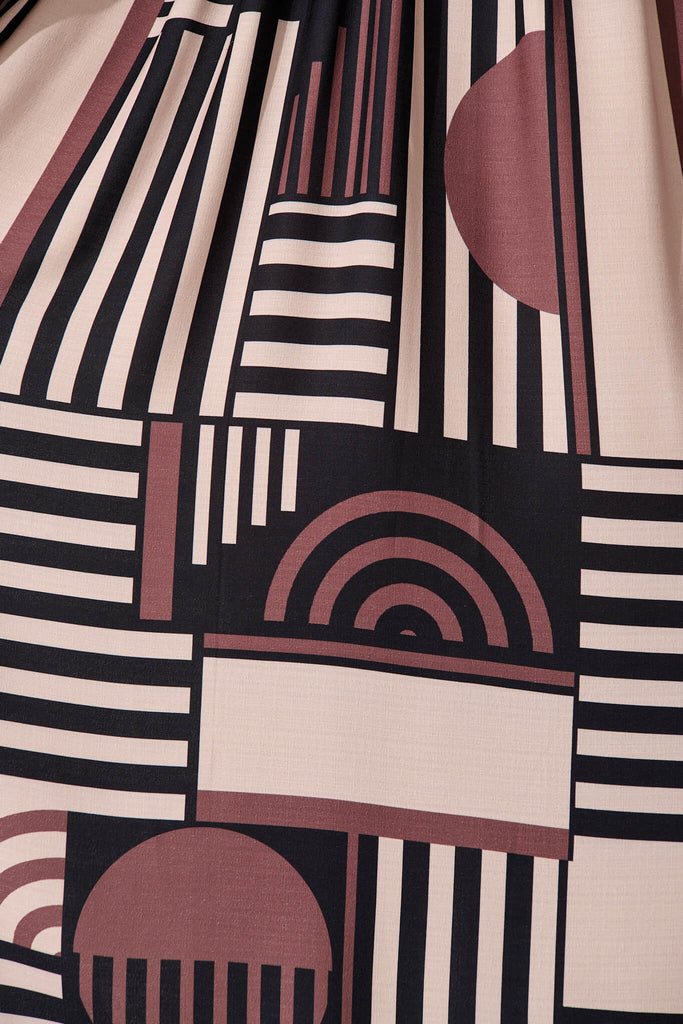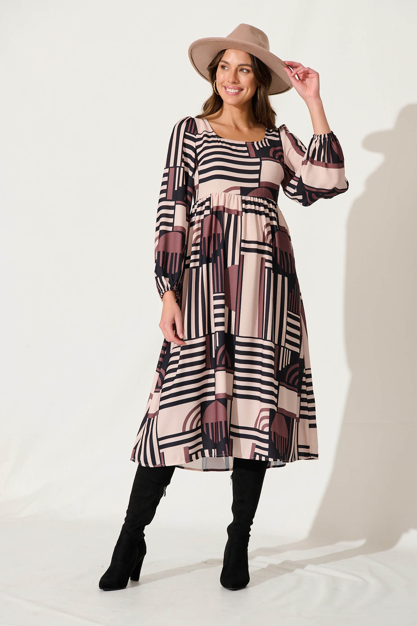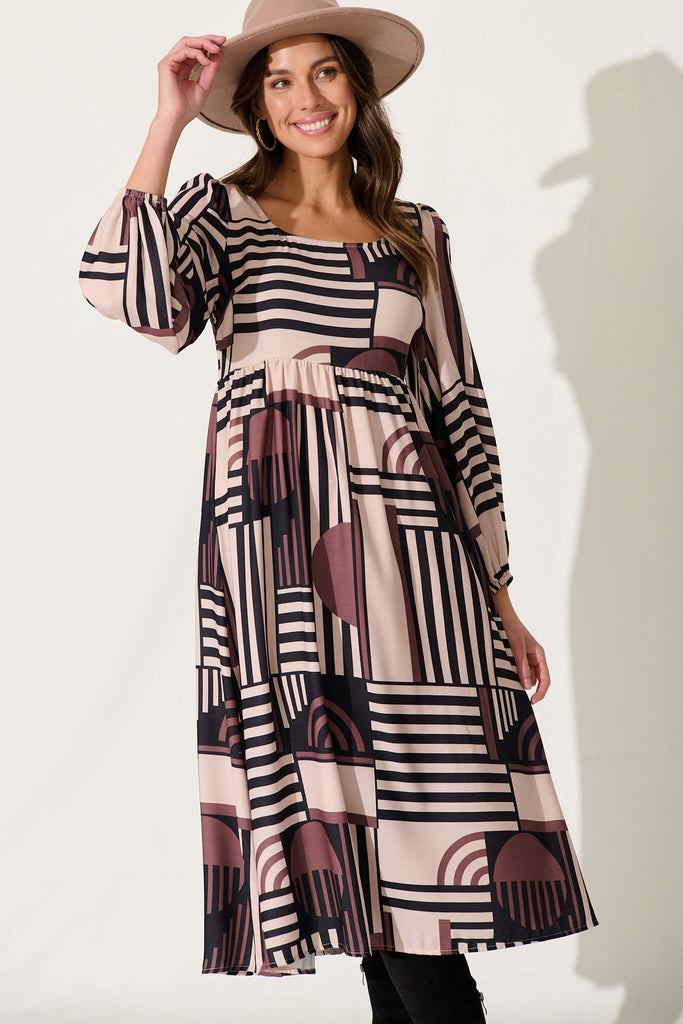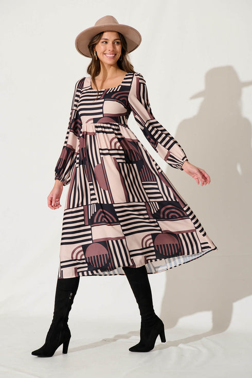 Anna Midi Dress In Beige With Black Geometric Linen Blend