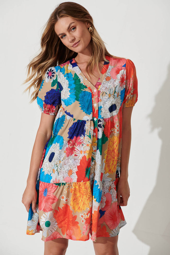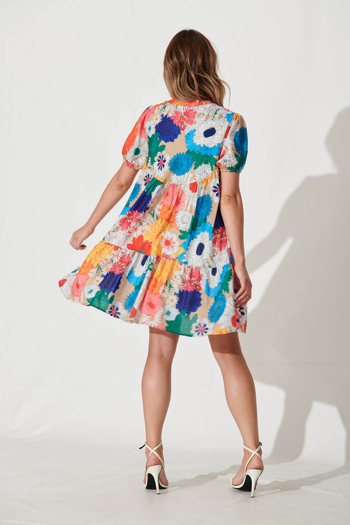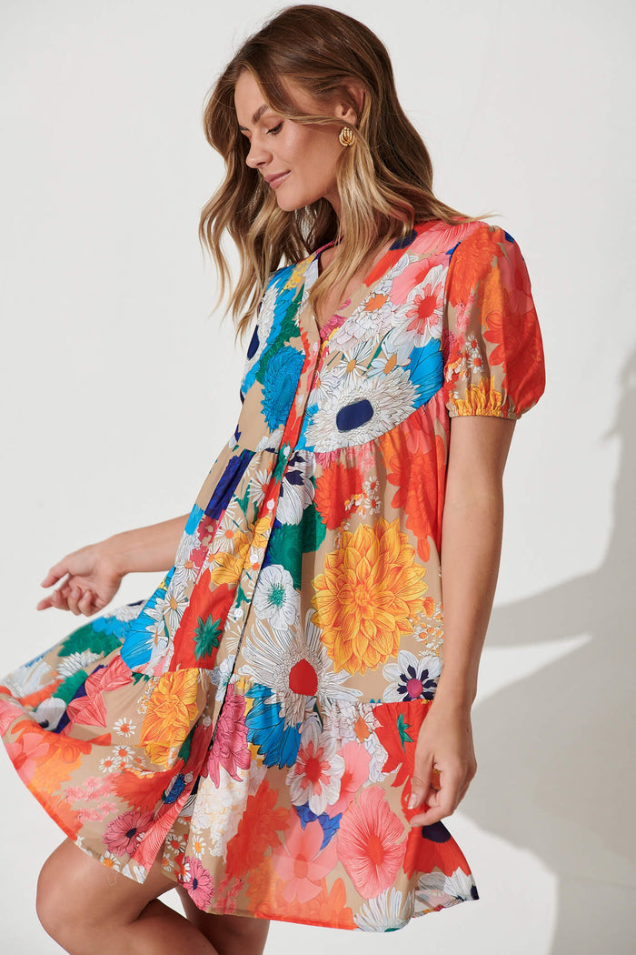 Annie Smock Dress In Bright Multi Floral Cotton Blend