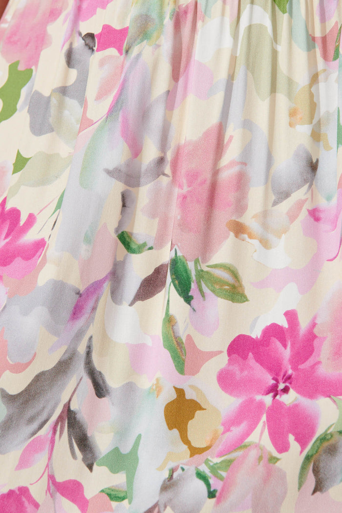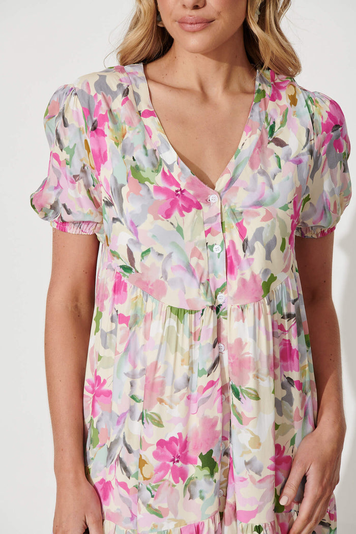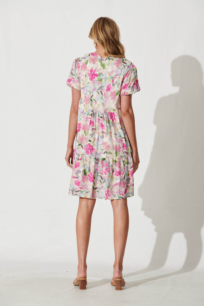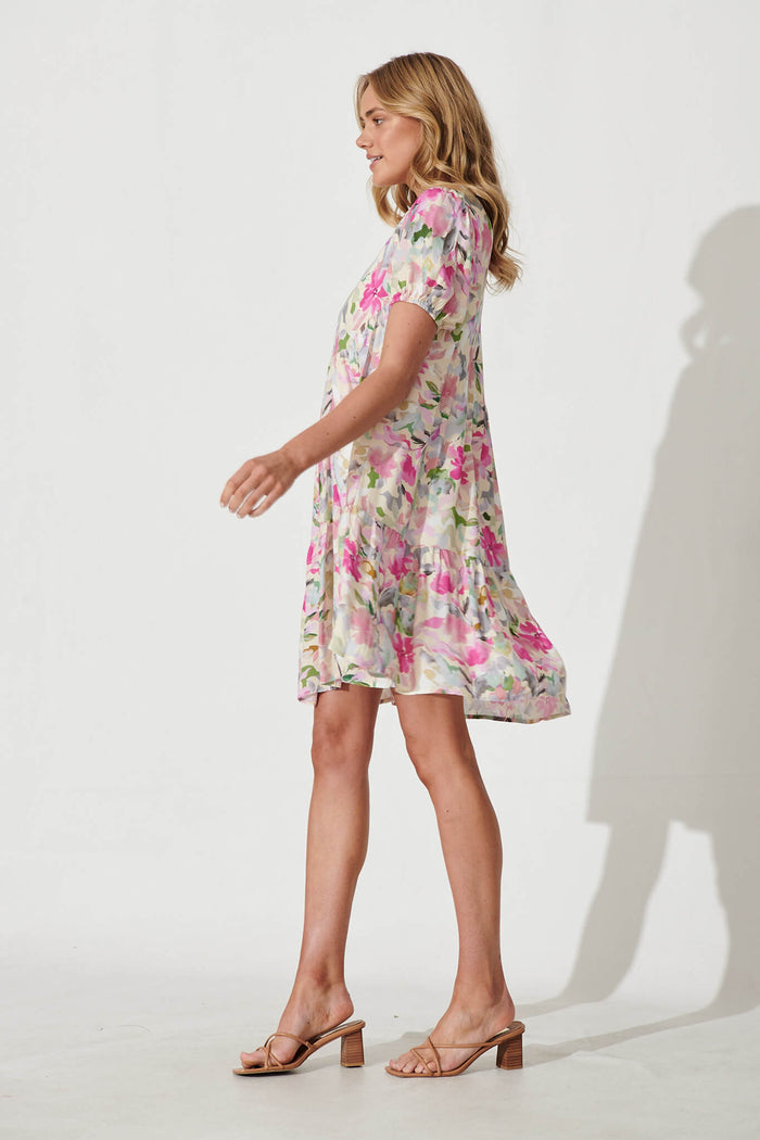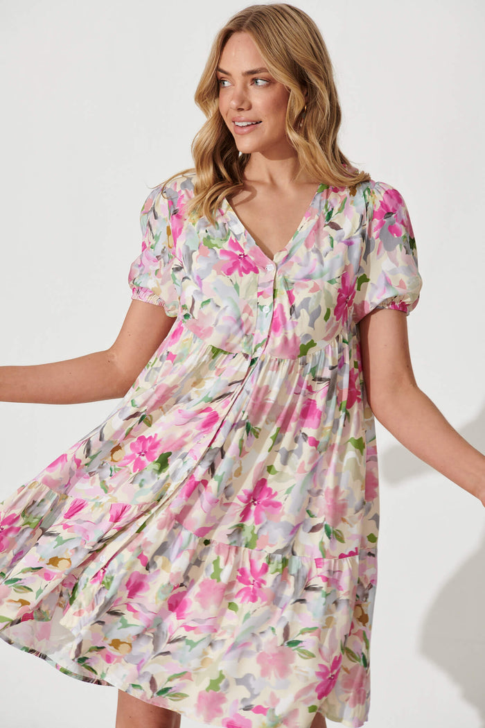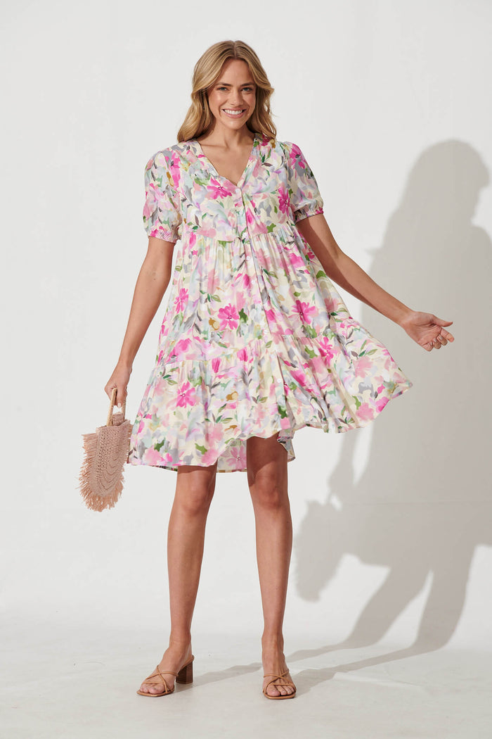 Annie Smock Dress In White With Pink Multi Floral Cotton Blend
