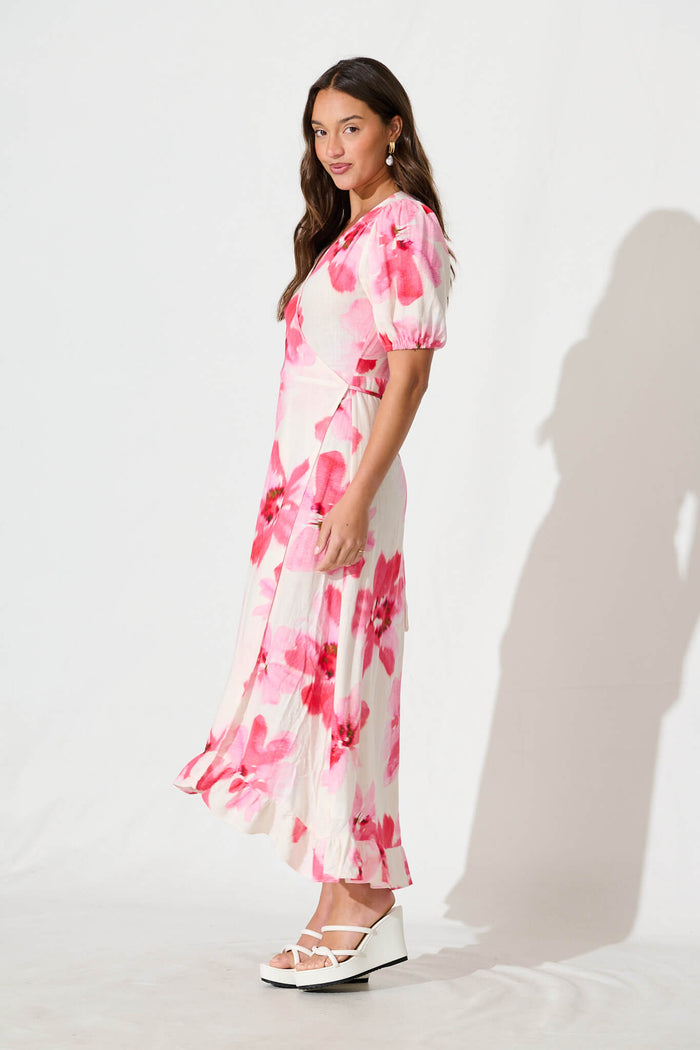 Annina Midi Wrap Dress in White with Pink Floral Linen Blend