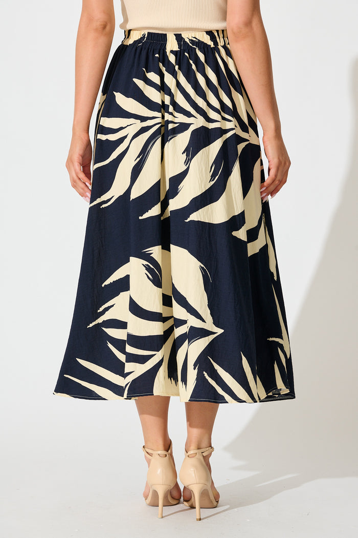 Aria Midi Skirt in Navy and Cream Leaf Print