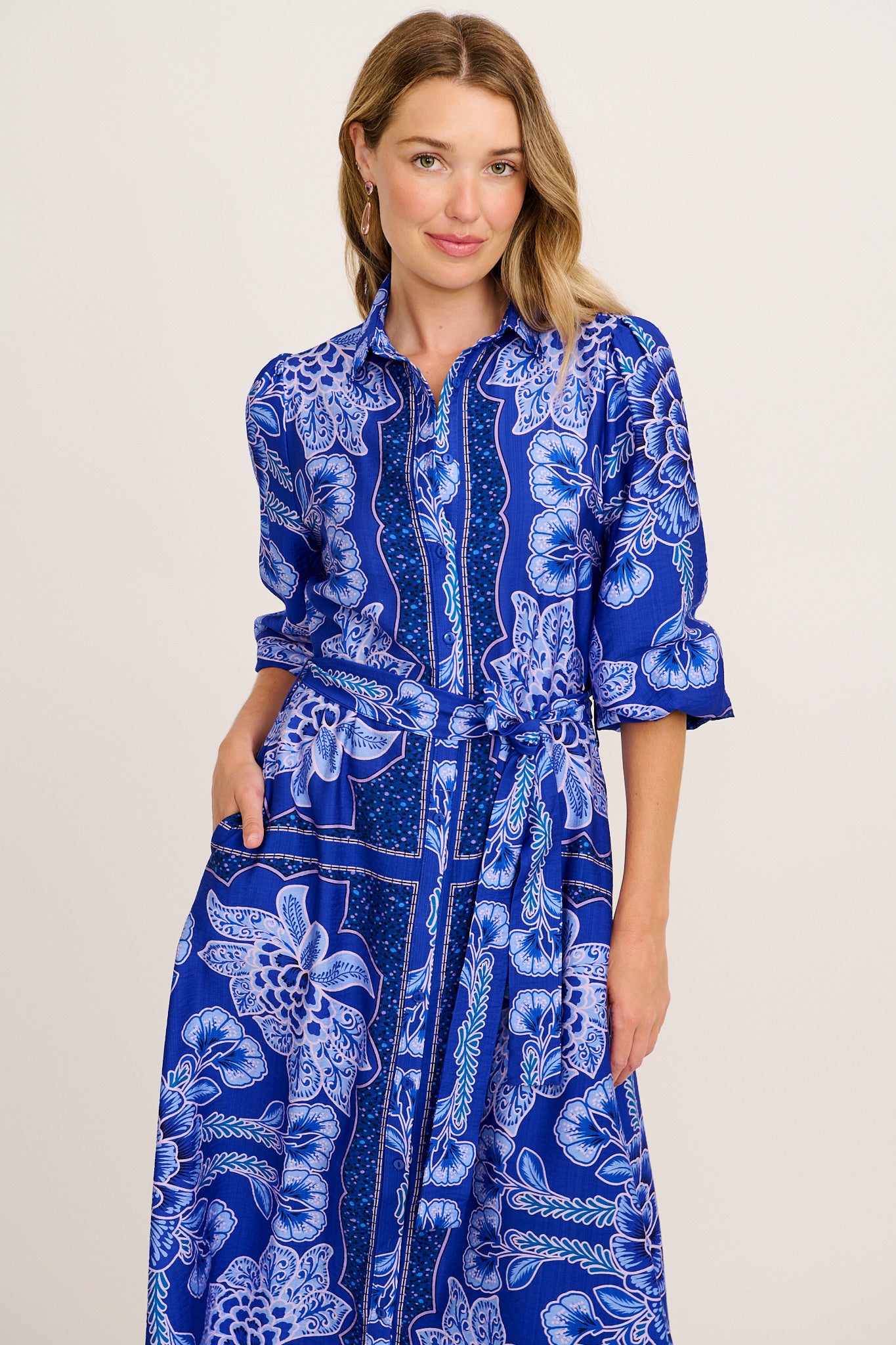 Crafted from a breathable rayon-linen blend, this non-stretch dress is unlined and easy to wear. A functional button-down front and collared neckline give it a classic shirt-inspired touch, while the puff 3/4 sleeves with encased elastic bring a soft, modern shape. A separate waist tie lets you define your silhouette, and functional pockets offer practicality (yes, pockets!).