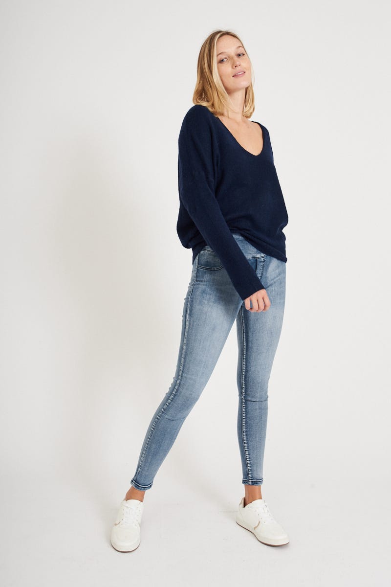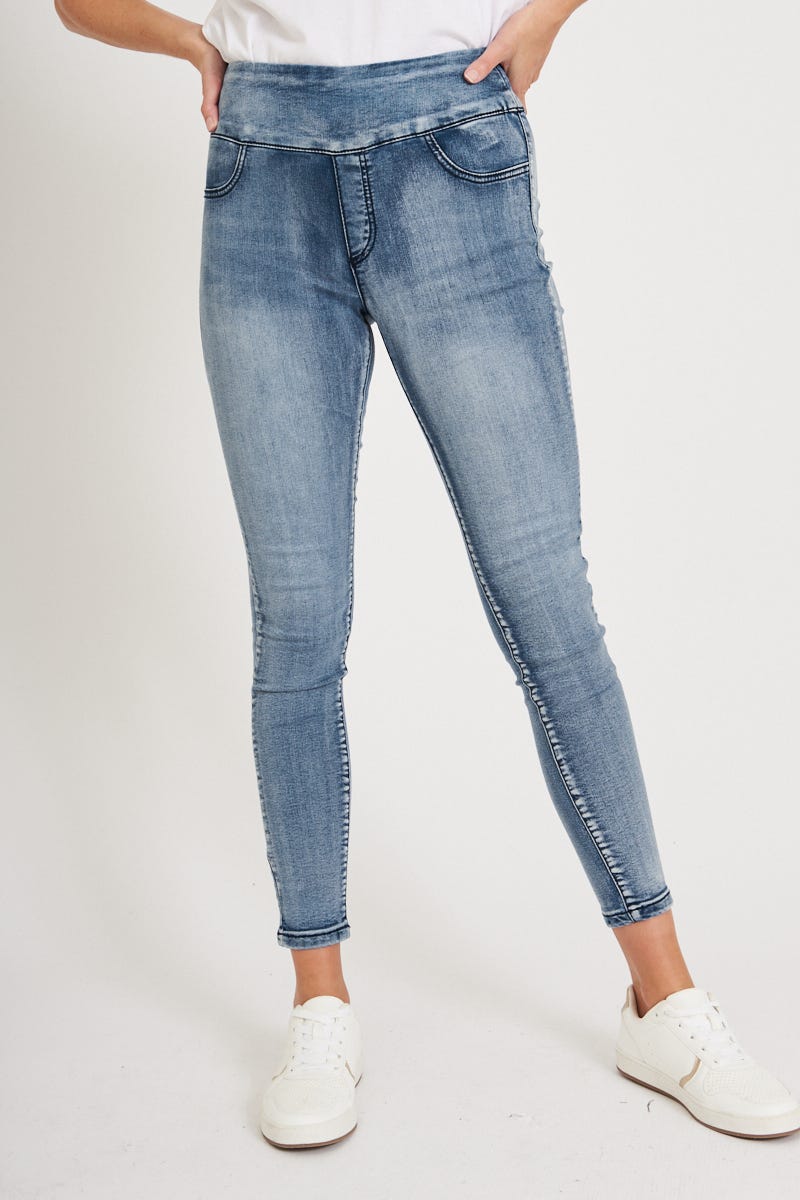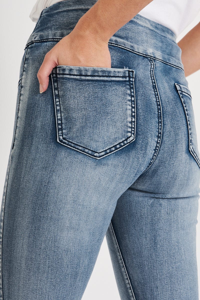 The Avia Stretch Denim in Blue are made from a super comfy fabric that is perfect for any occasion. These ankle length pants include pockets and are finished in a light wash. Pair yours with your fave knit!