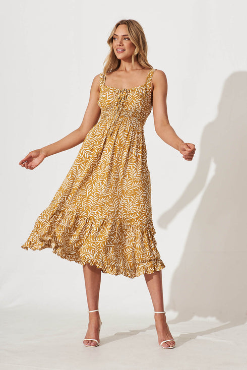 Beautiful Midi Dress In Mustard With White Leaf Print