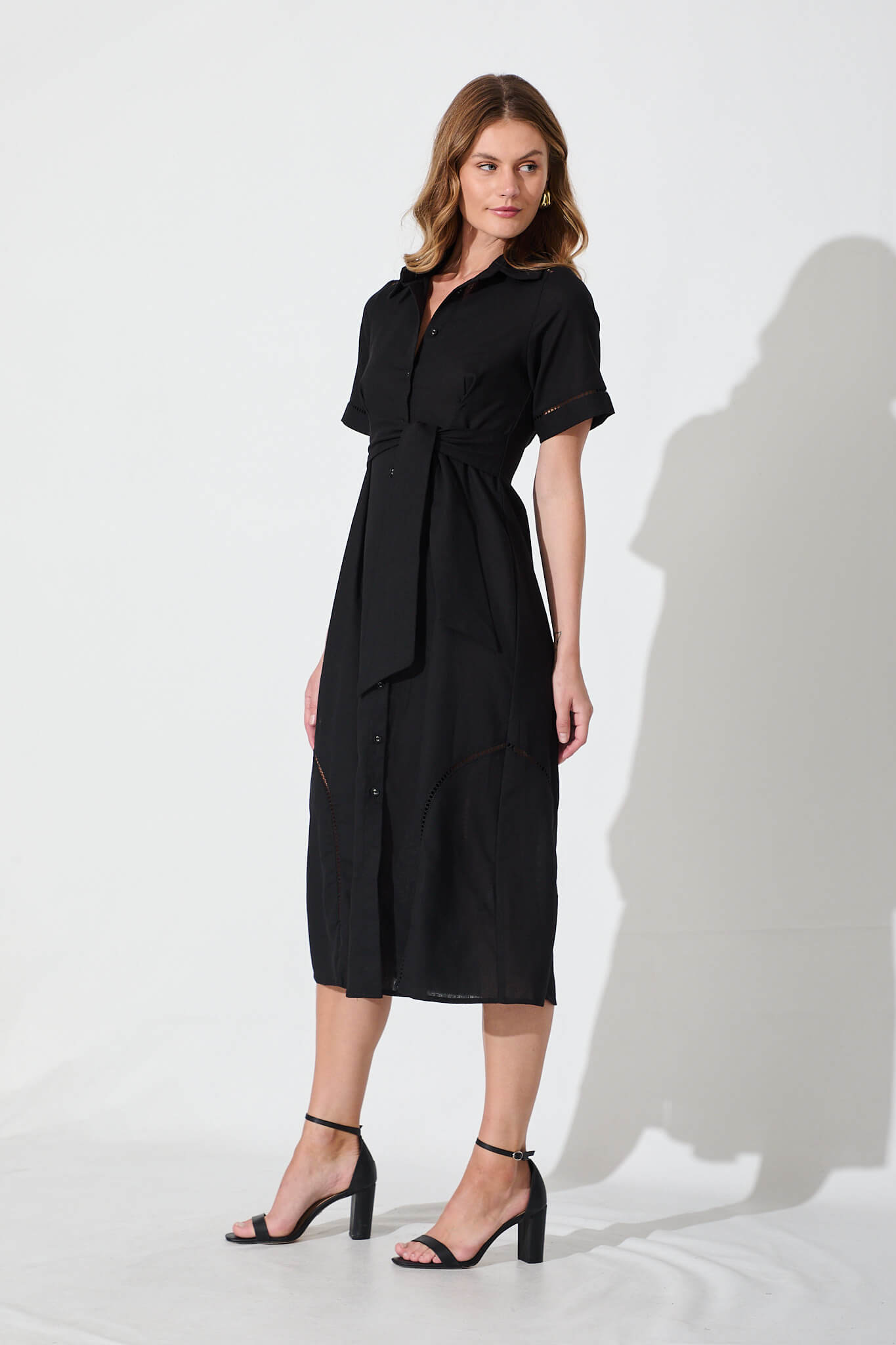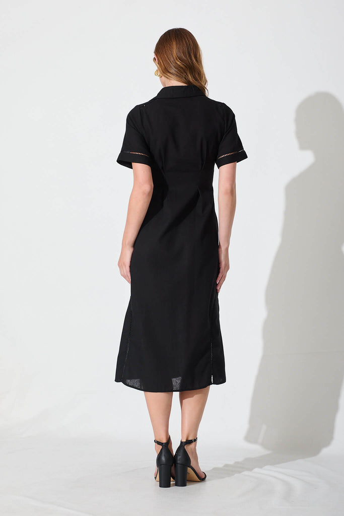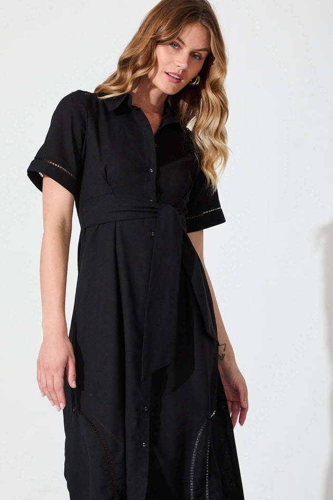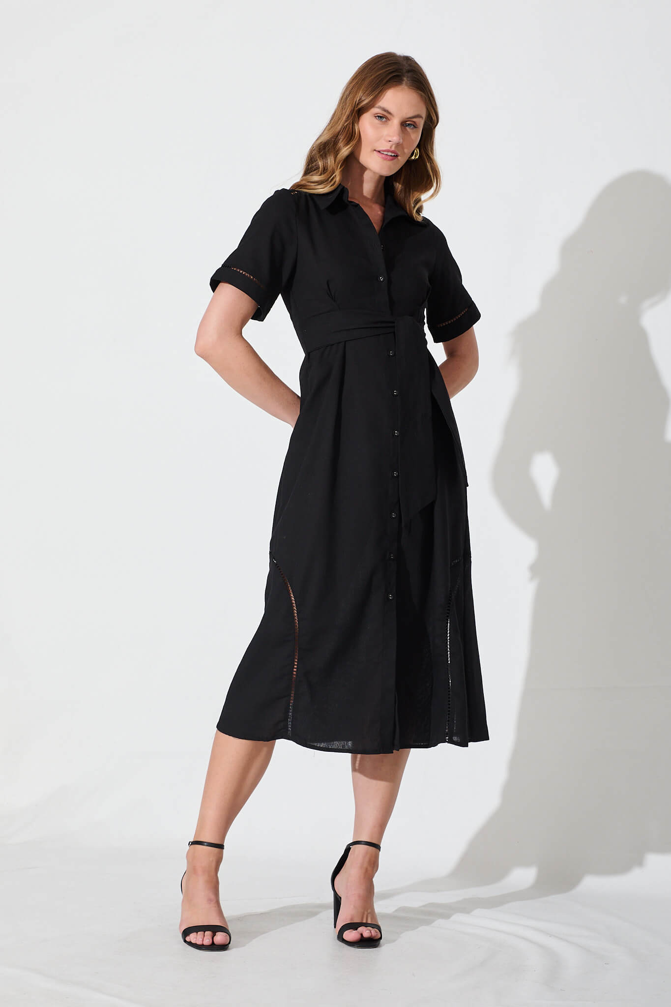 Bennett Midi Shirt Dress In Black Cotton Linen