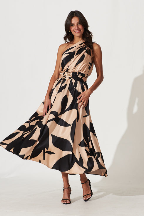 Bernadette One Shoulder Midi Dress In Brown With Black Print Satin