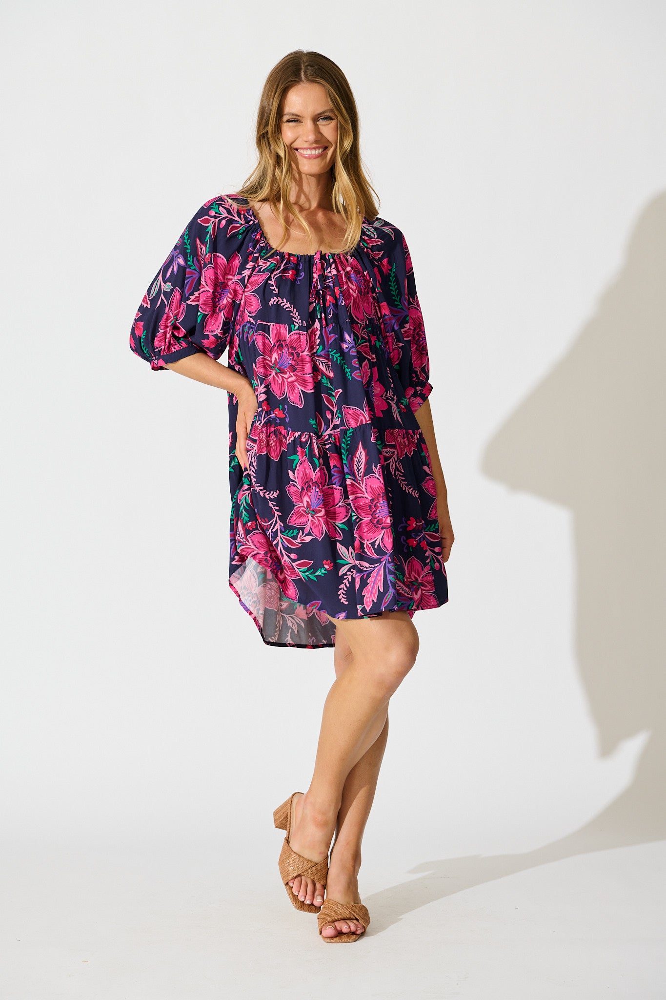 The Beryll Smock Dress in Navy with Pink Floral is an easy, breezy piece made for warm days and relaxed evenings. With its effortless shape and playful print, it’s the dress you’ll love to slip on again and again.