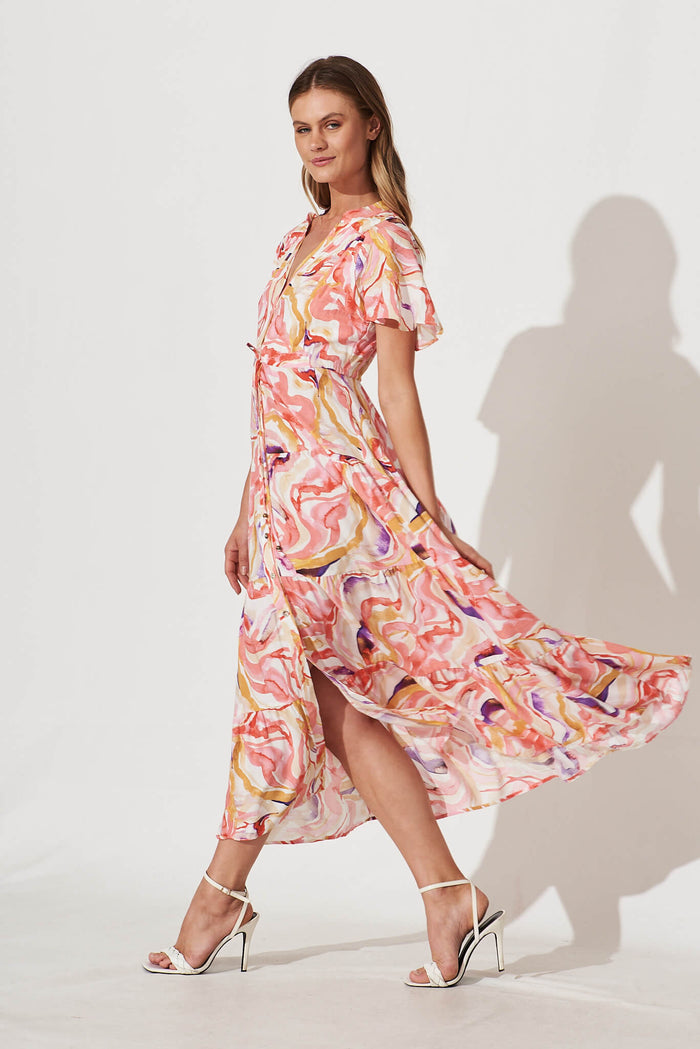 Beverly Maxi Shirt Dress In Pink Multi Swirl Print