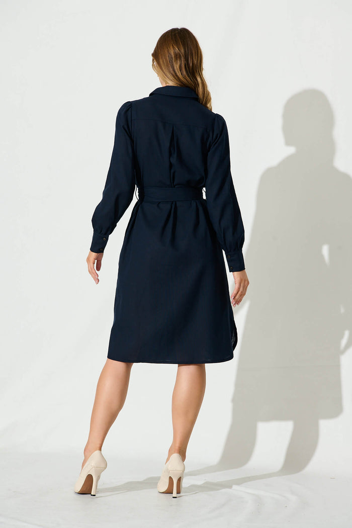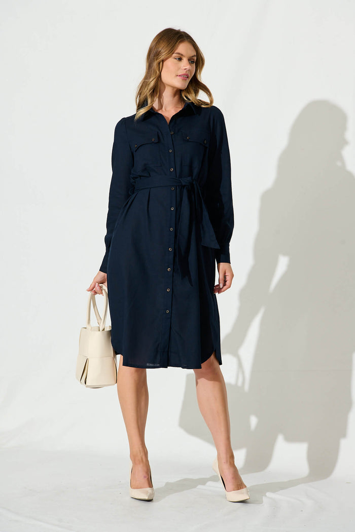 Britt Midi Shirt Dress In Navy Cotton Linen