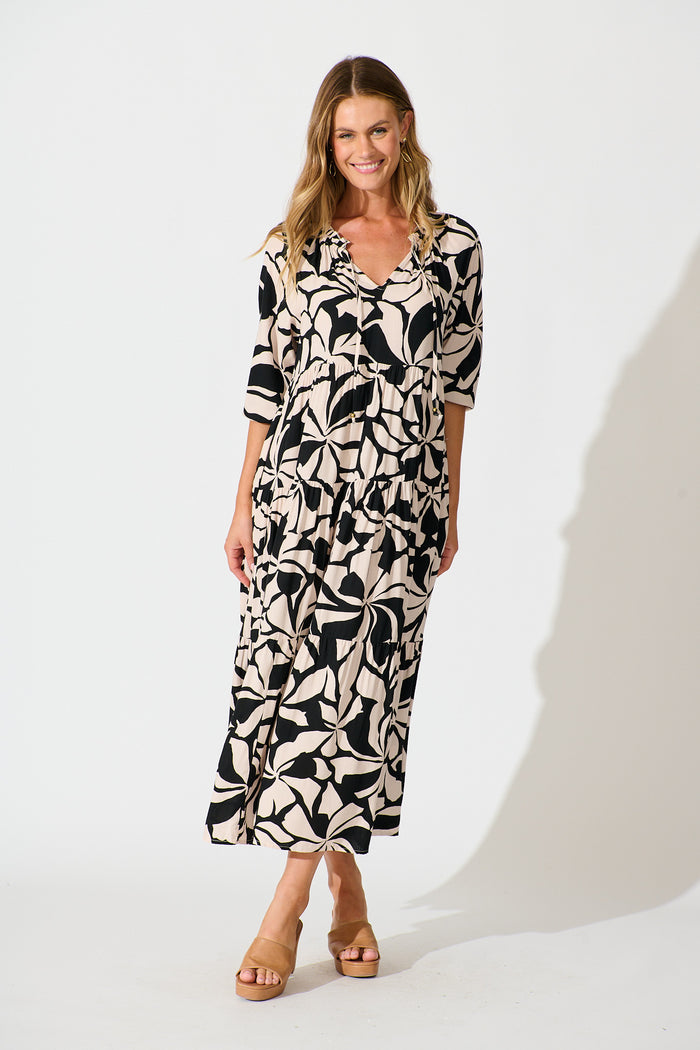 Comfort meets fun with our Brooke Maxi Smock Dress. It features a flattering fit V-neckline & a free-flowing tiered skirt. Style this boho inspired piece with, white strappy sandal and basket bag to match.