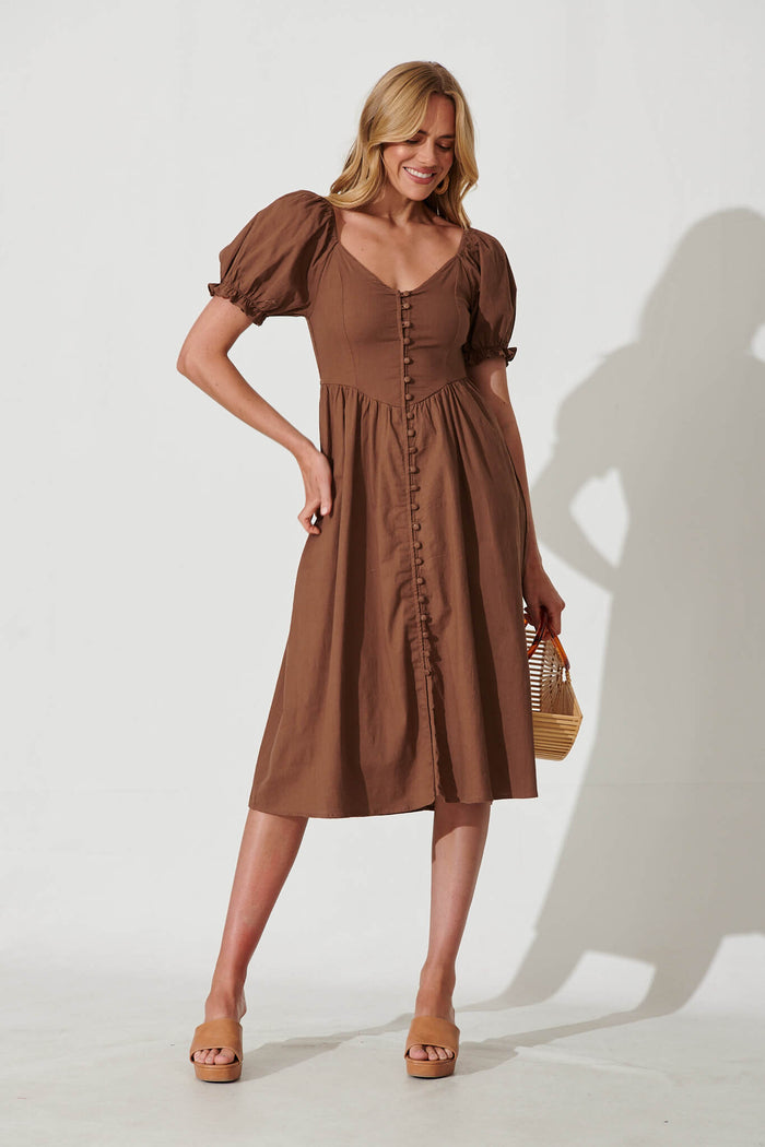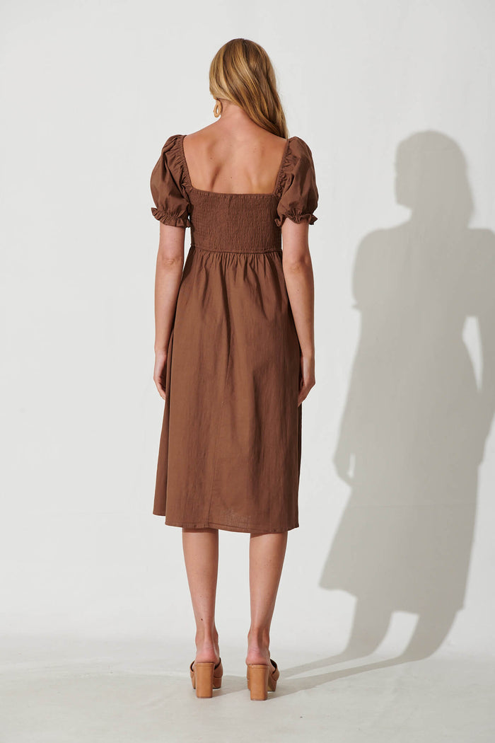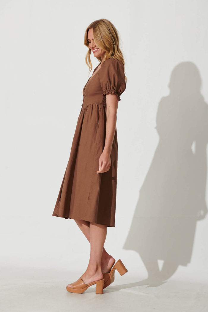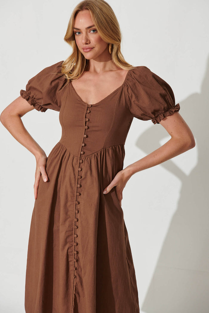 Carter Midi Dress In Chocolate Linen Cotton Blend