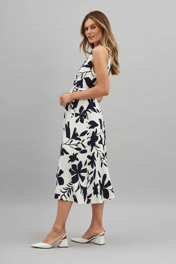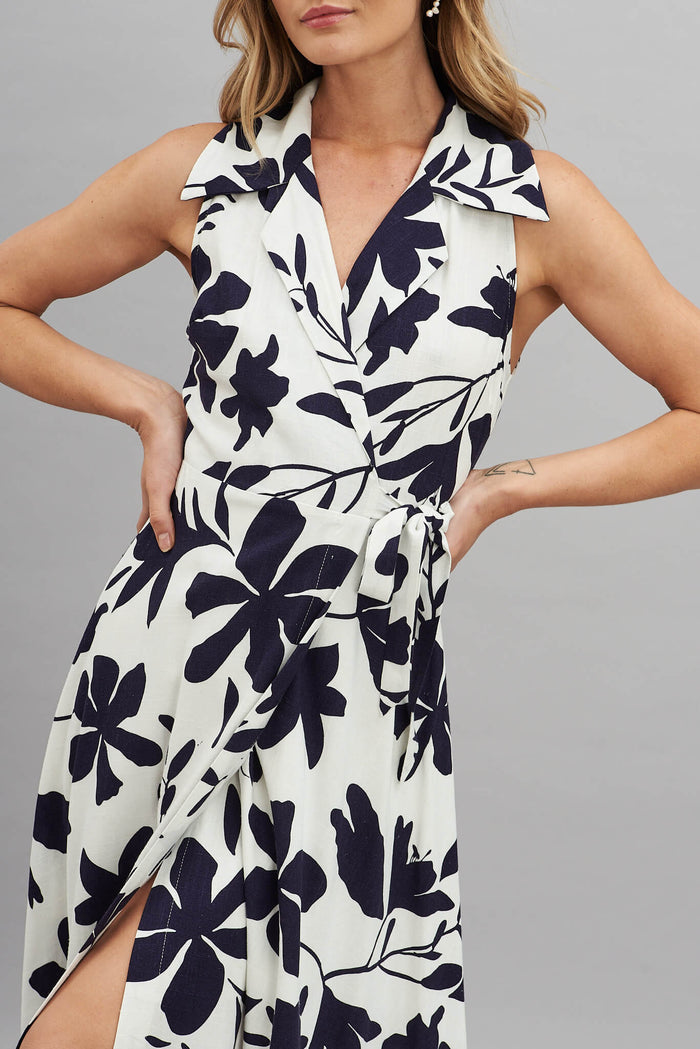 Casablanca Midi Wrap Dress In Navy Floral Linen Blend
