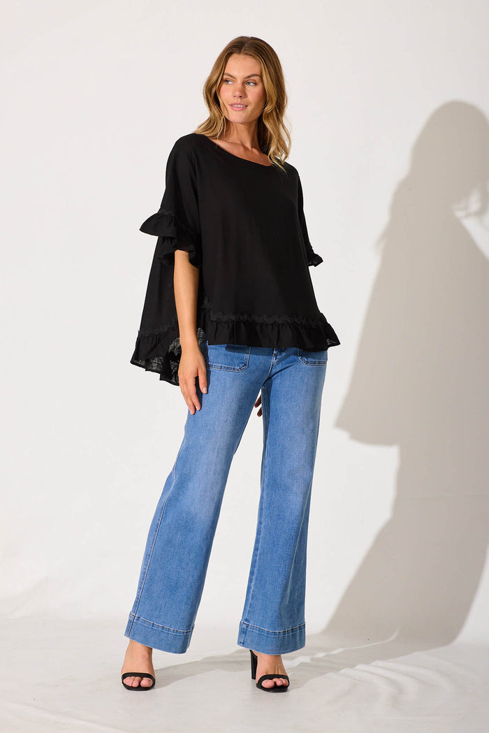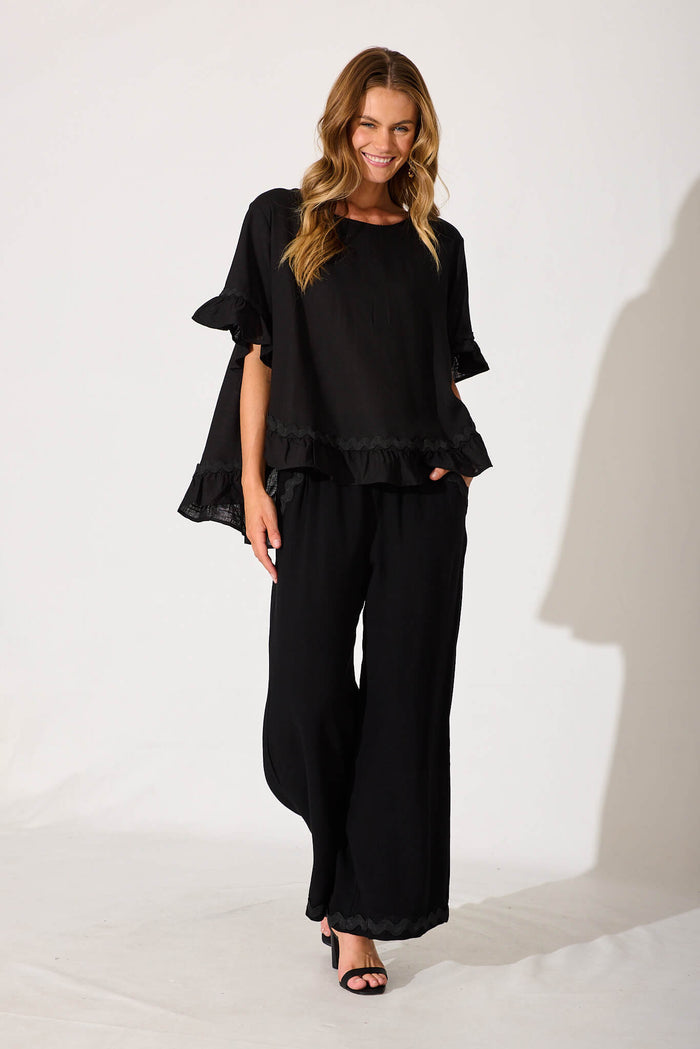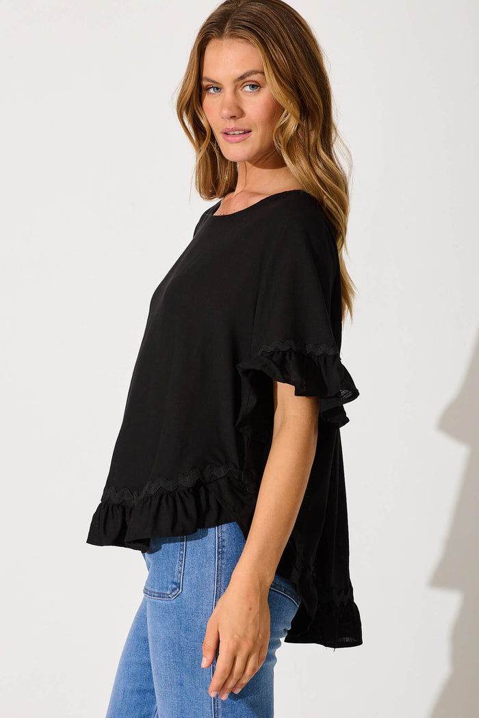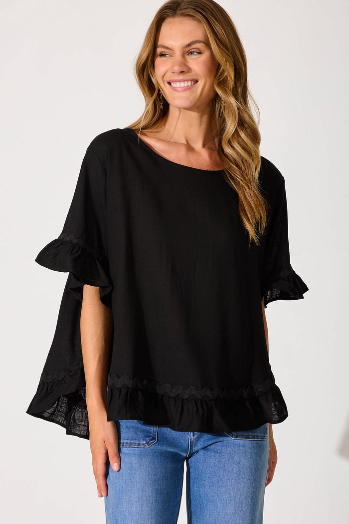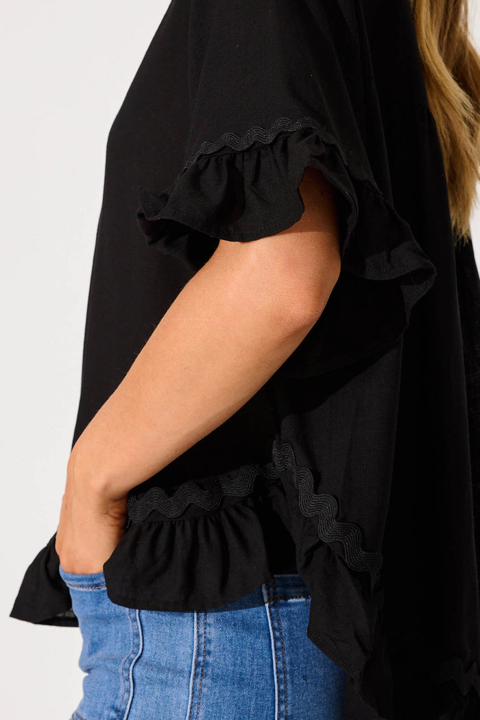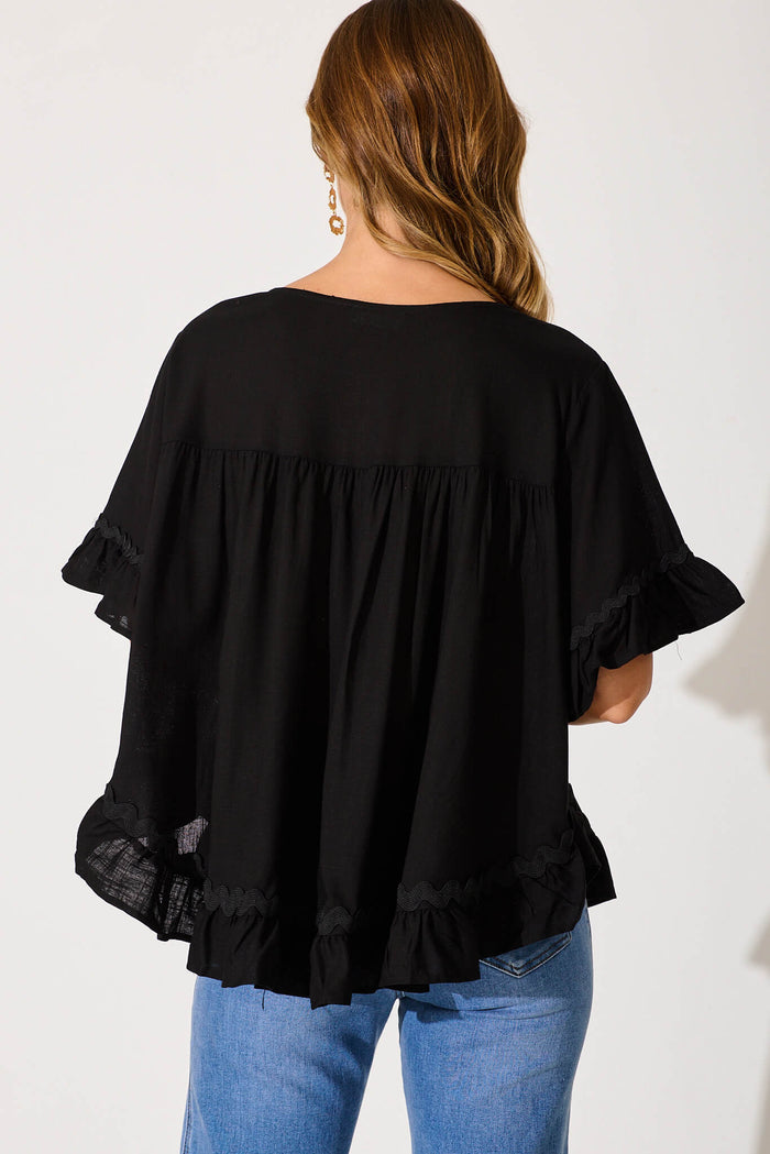 Catharina Top In Black With Ric Rac Trim Linen Blend