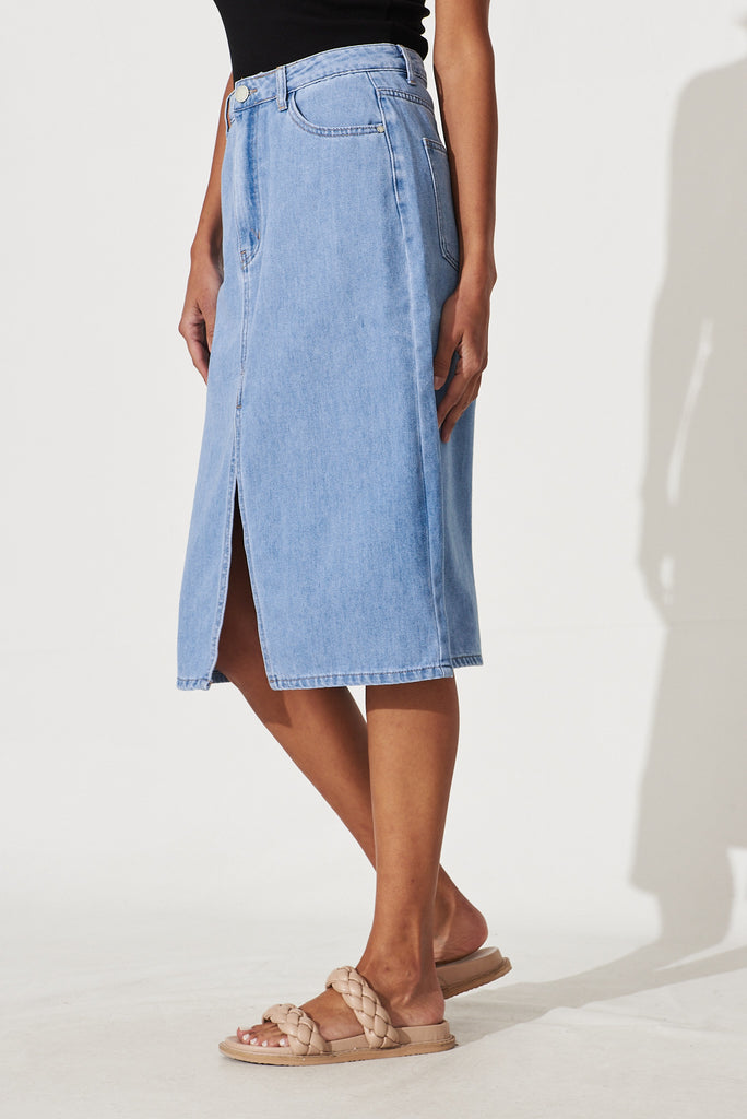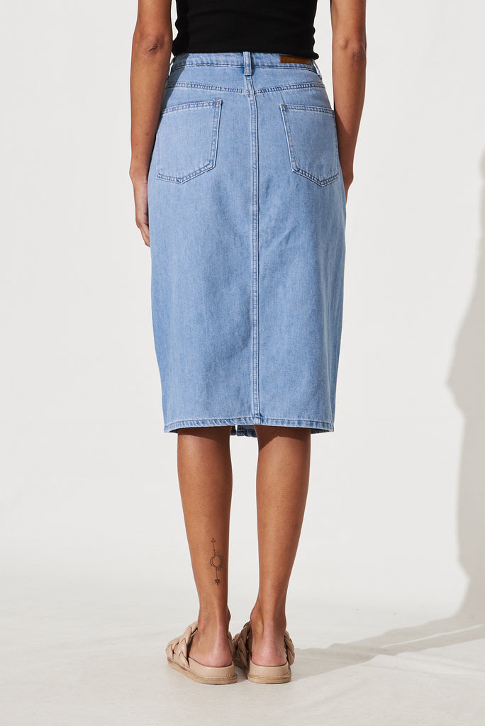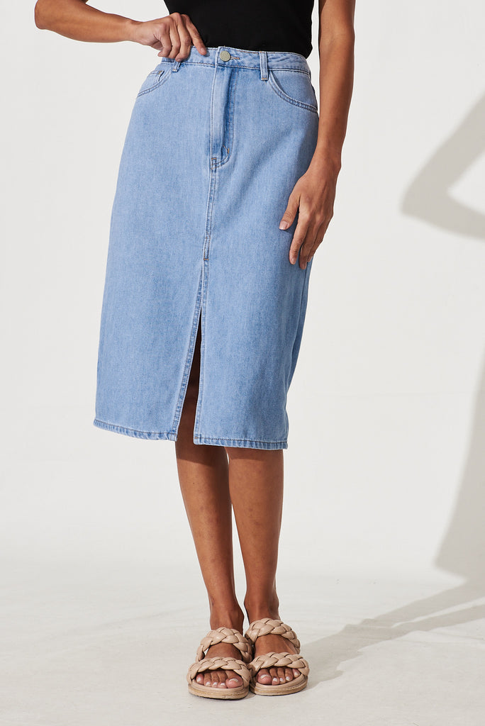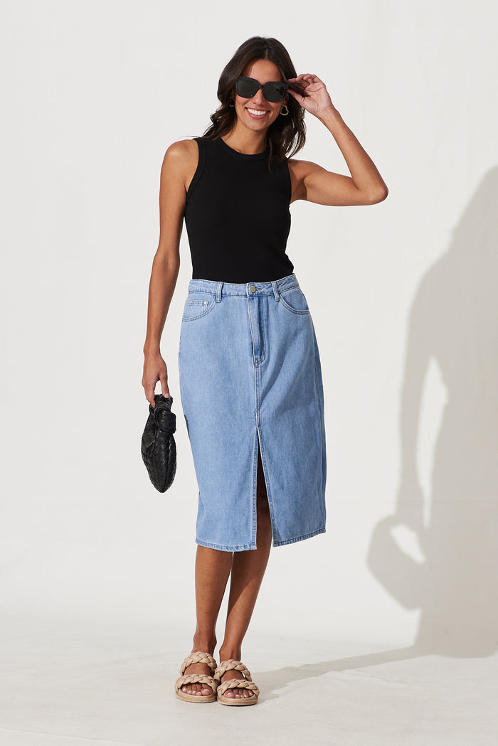 Level up your denim game with our Cha Cha Midi Denim Skirt! A modern take on a wardrobe staple that can be dressed up or down with ease. For the ultimate off duty outfit, style with a white tee, boyfriend blazer and finished off with a pair of fresh white sneakers!