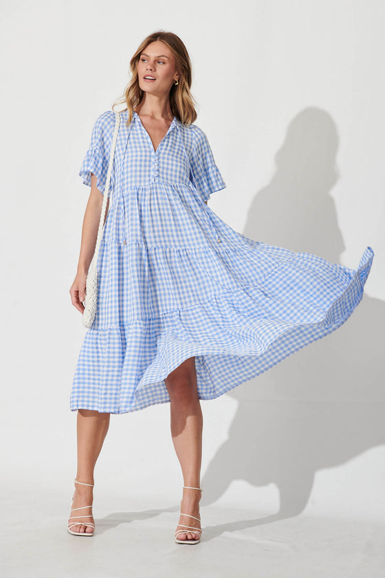 Charliese Midi Smock Dress In Blue And White Gingham Cotton Blend