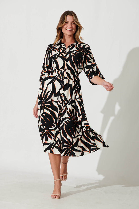 Charlotte Midi Shirt Dress In Black With Cream Print