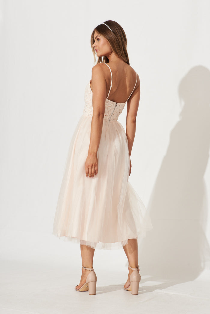 Chloe Midi Dress In Champagne Lace And Tulle Skirt