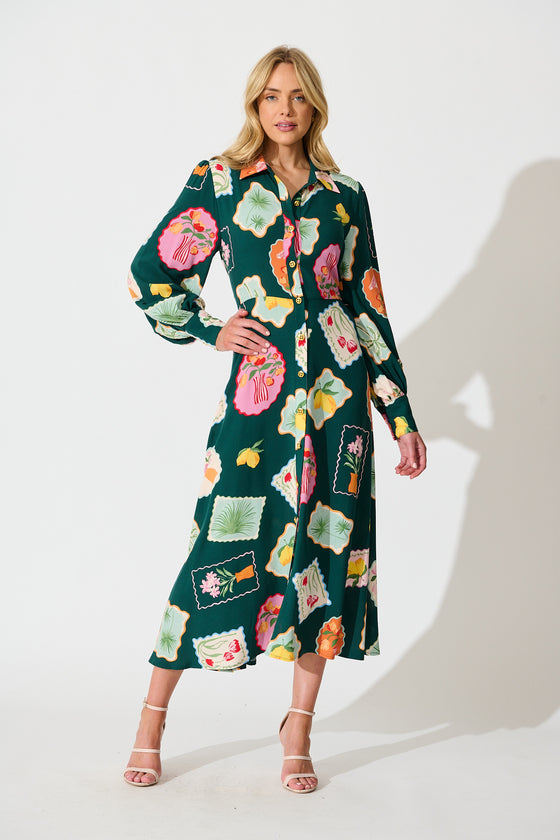 Ciao Bella Maxi Shirt Dress in Emerald Postcard Print