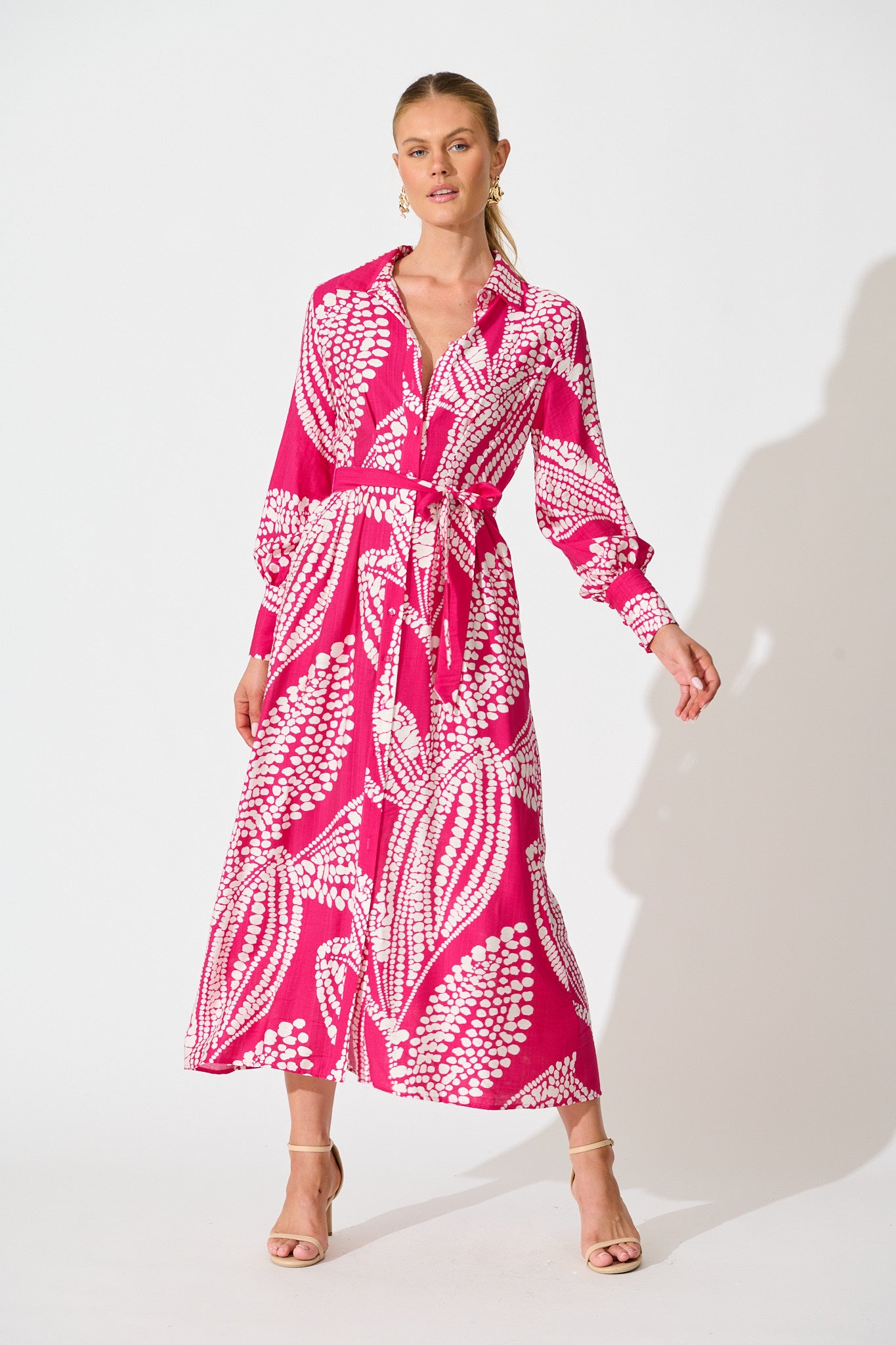 Clara Maxi Shirt Dress in Magenta with White Print