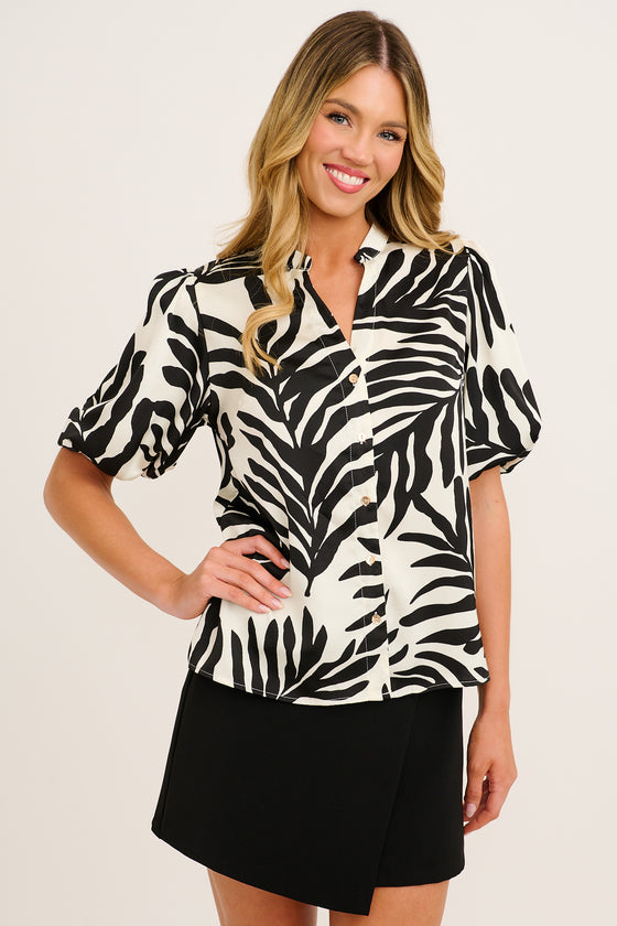 Crafted from a lightweight, Wash & Wear satin, this non-stretch blouse features a flattering V-neckline, half puff sleeves with encased elastic, and textured gold buttons through the front. The monochrome leaf print offers impact without fuss, and it’s perfect for layering under blazers or styling with denim. Bonus: it’s also breastfeeding-friendly.