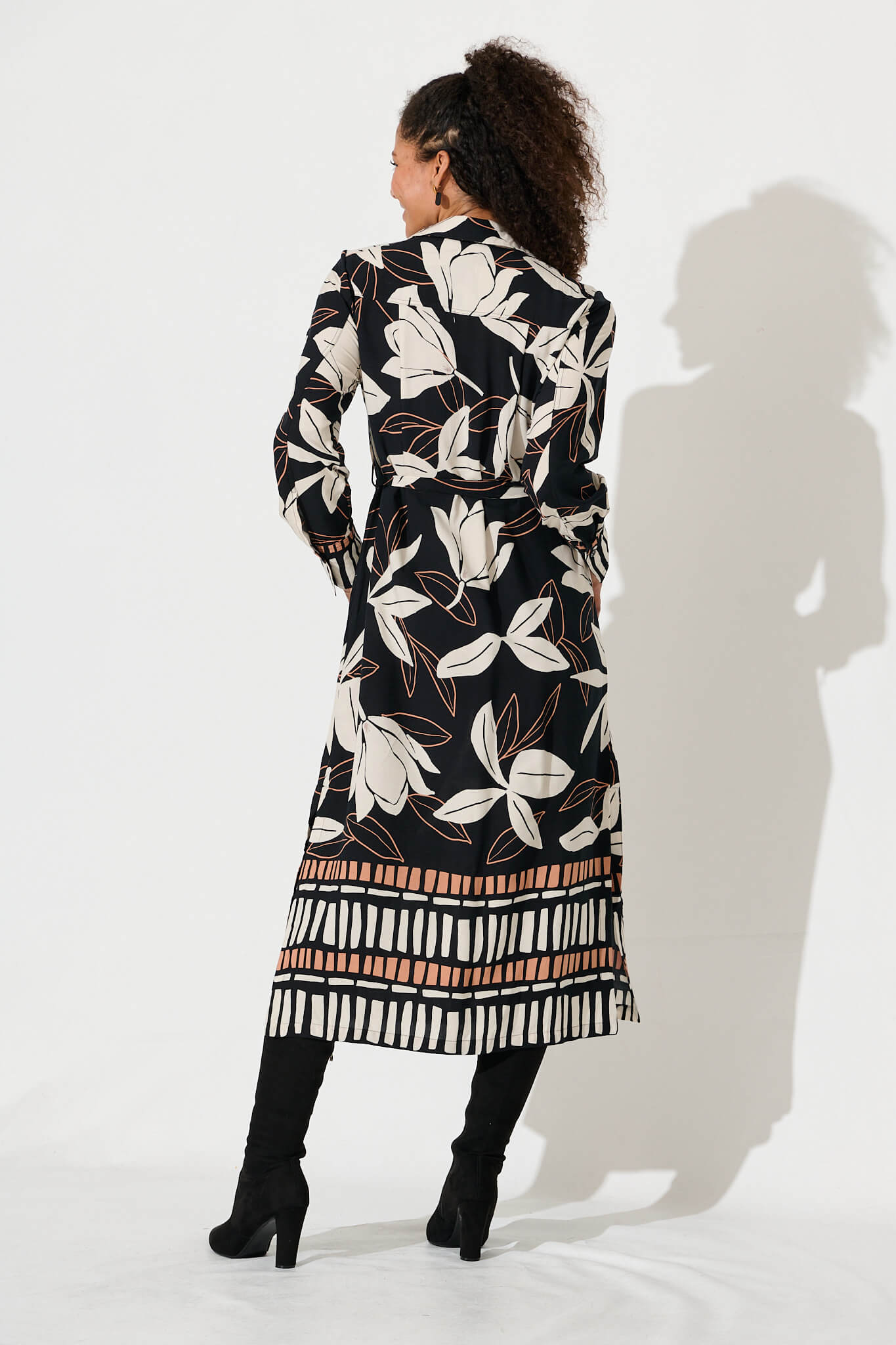Cleo Midi Shirt Dress In Black With Cream Floral Print