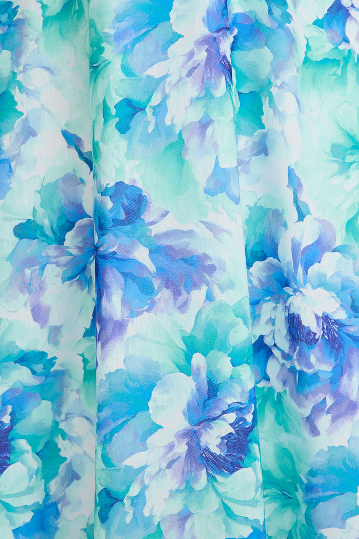 Made from a textured, non-stretch linen blend with a fully lined finish, it offers structure without stiffness. The soft blue base is elevated with an embroidered floral print that feels equal parts refined and fresh. A shirred back waist ensures all-day comfort, while the hook-and-eye front closure gives styling versatility. Puff sleeves and a flowing maxi hemline balance charm with elegance, and the V-neck flatters your neckline beautifully.
