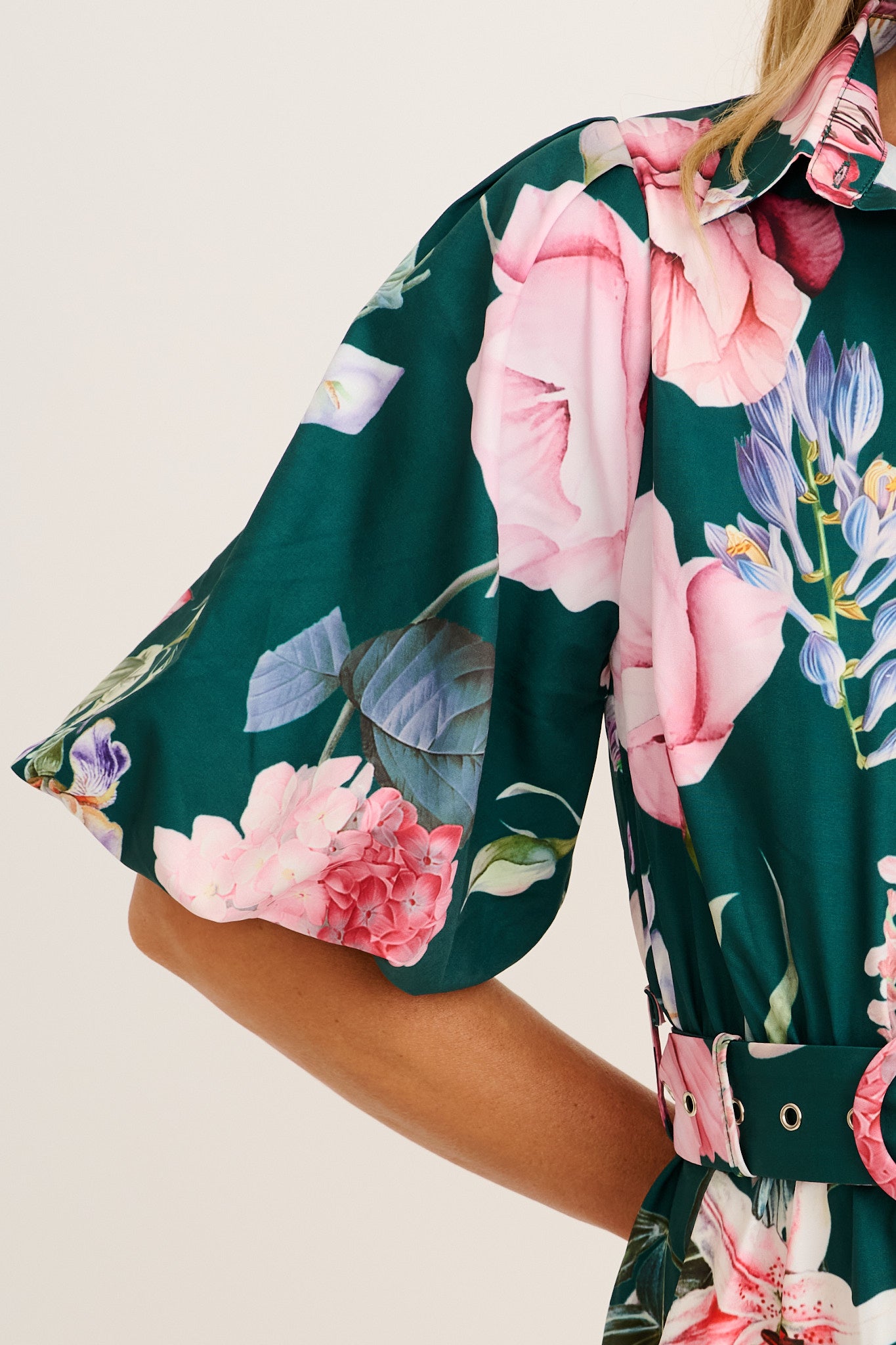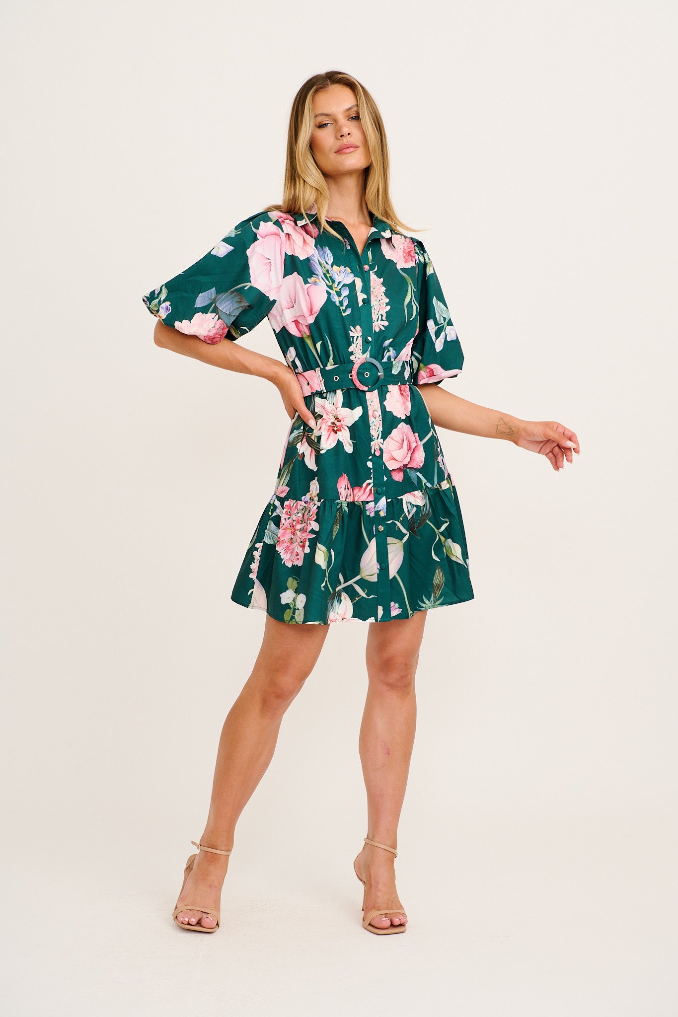 For those days when you need to look pulled together in seconds — meet the Courtney Shirt Dress in Green with Blush Floral. This flattering mini is fresh, feminine, and full of thoughtful details that make styling a breeze.