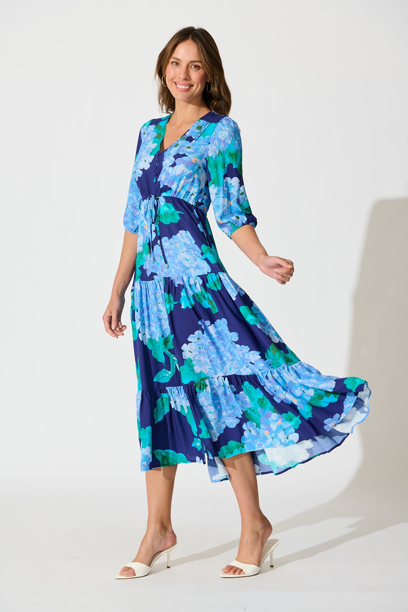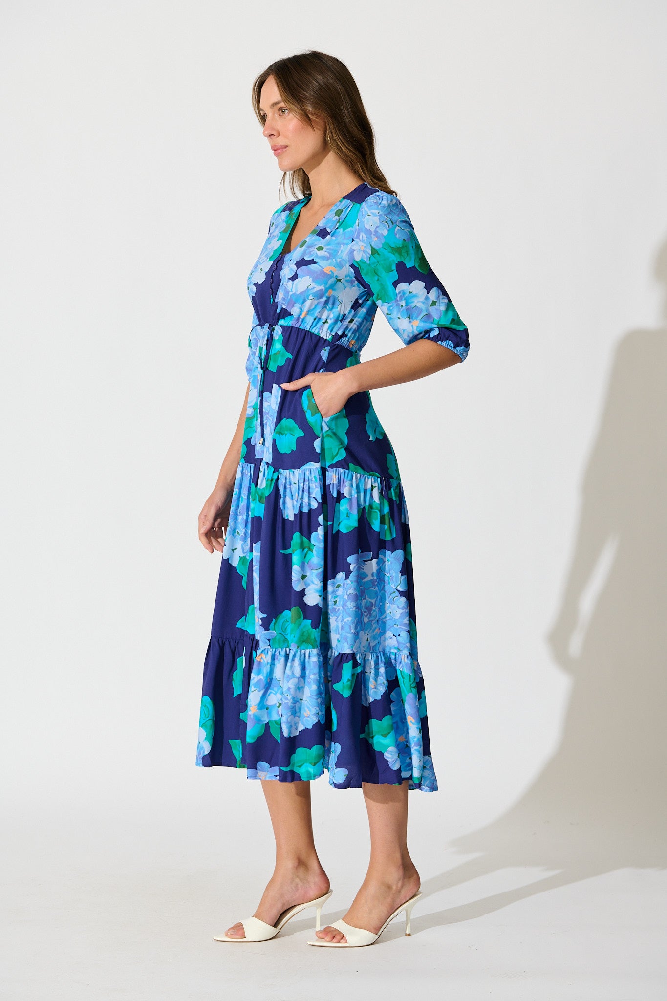 Bright and bold, the Danielle Midi Dress in Blue Floral feels like sunshine made wearable. The vivid blue floral print bursts against soft fabric, and a V‑neckline paired with a split front gives it flow and femininity with each step.