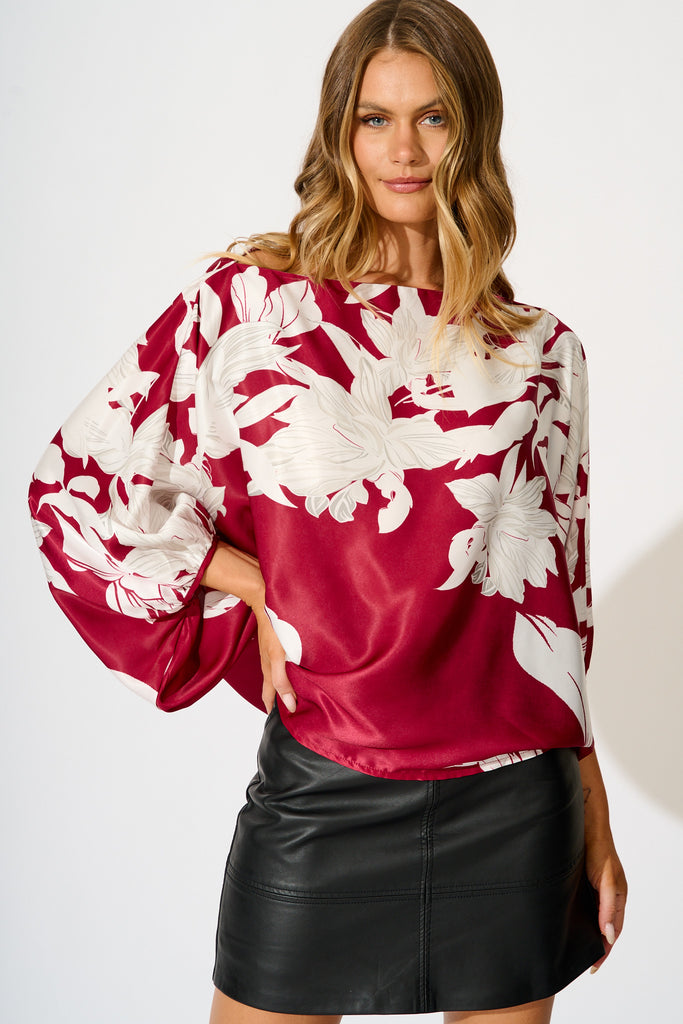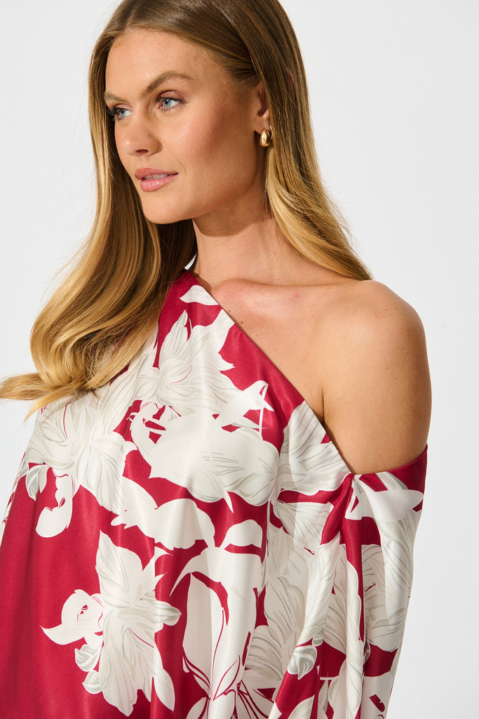 Darcy Off Shoulder Top in Red with White Floral Print Satin
