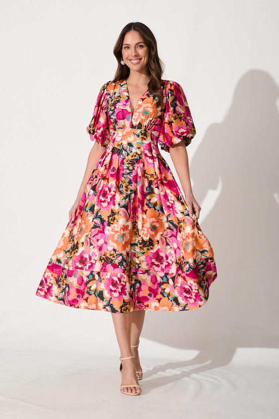Daydreamer Midi Dress In Black With Bright Multi Floral