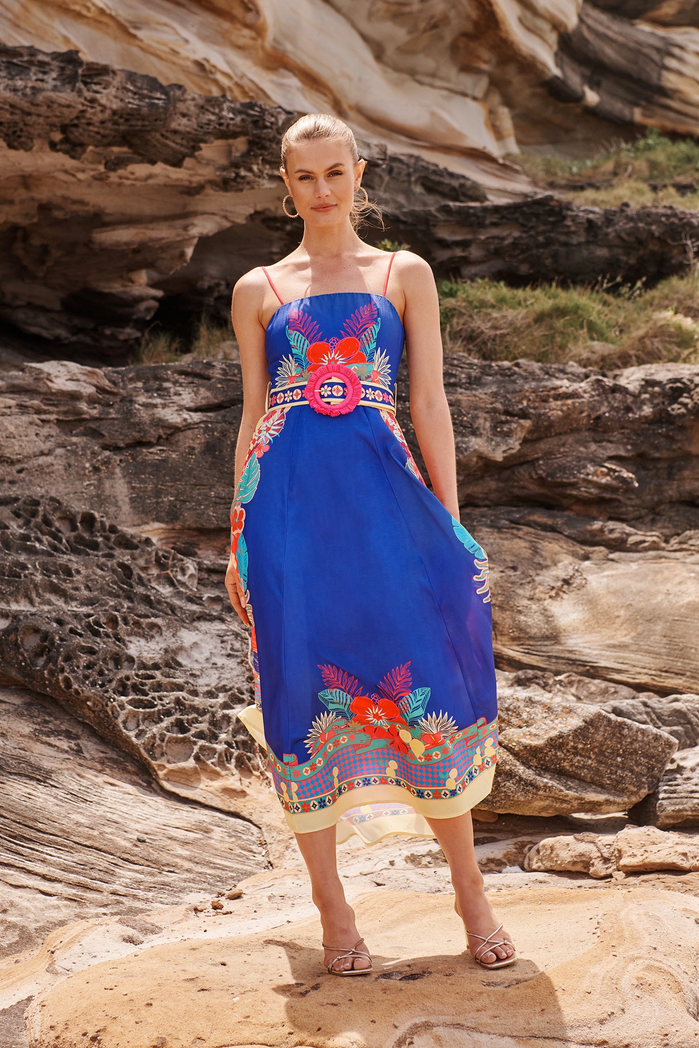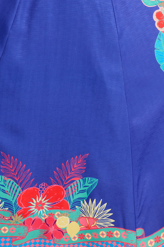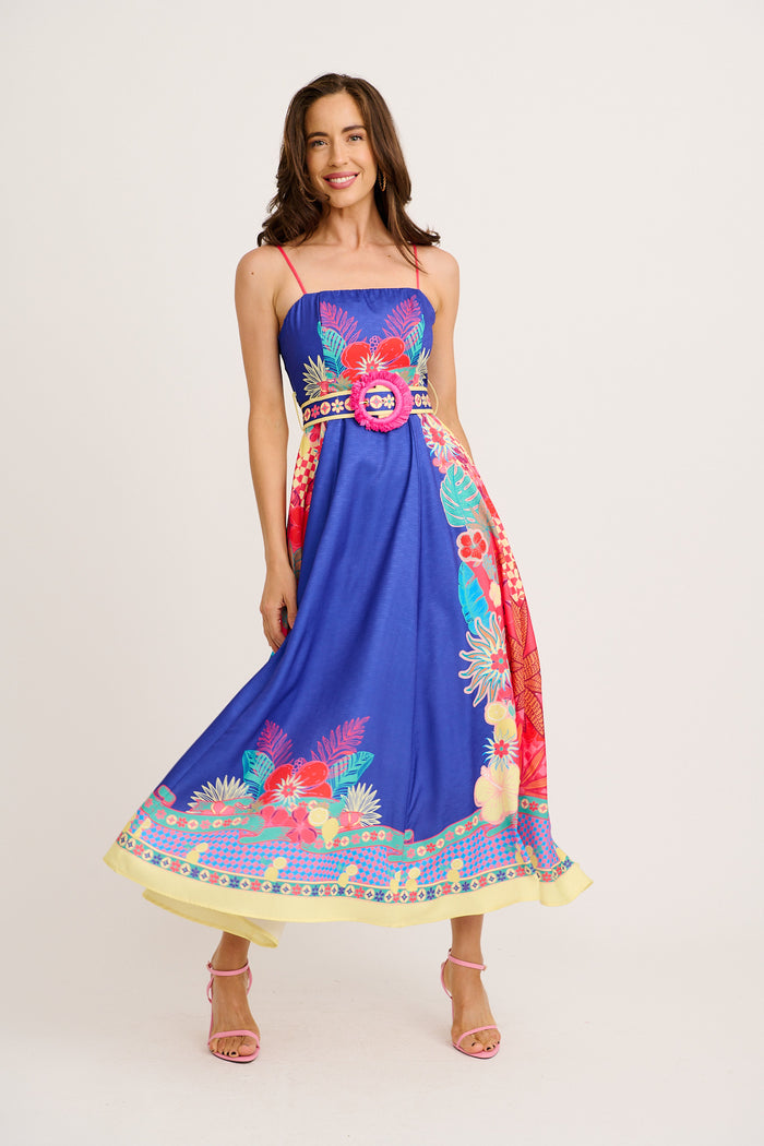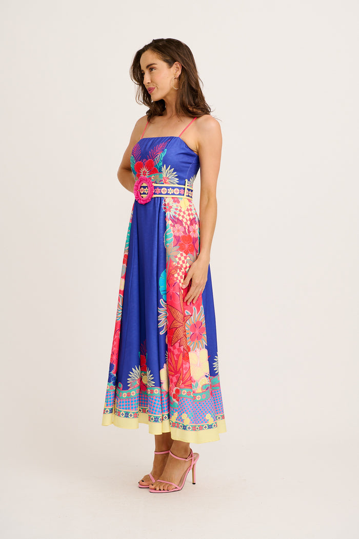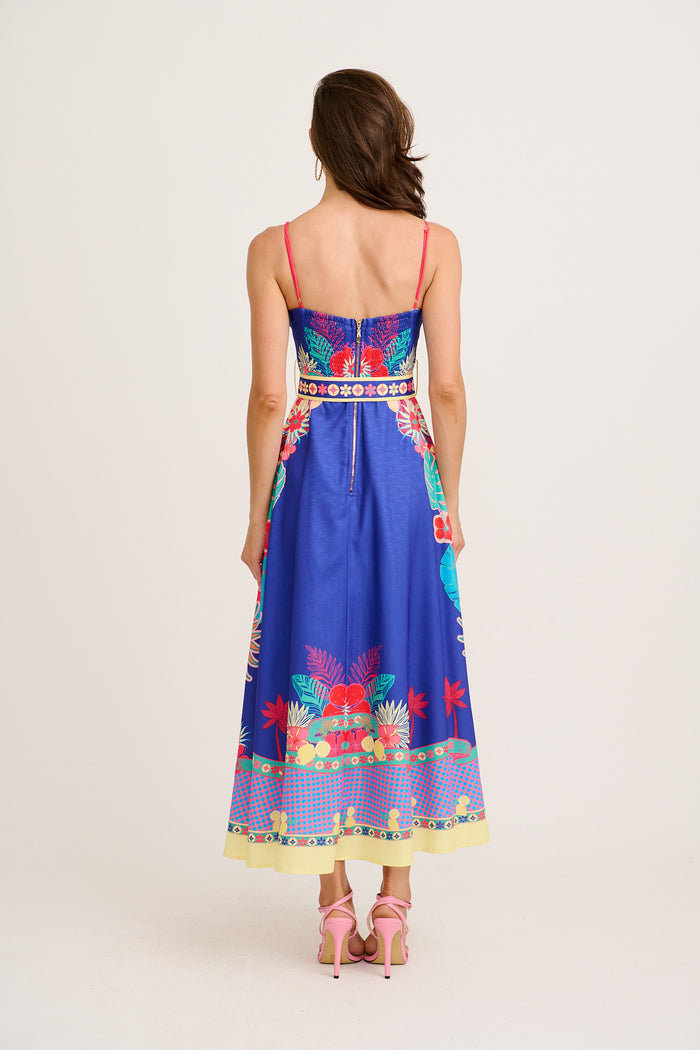 The Daylight Dream Maxi Sundress in Blue with Multi Print Linen Blend brings bold prints to a romantic shape. Ideal for events or escapes, it pairs elegance with ease.