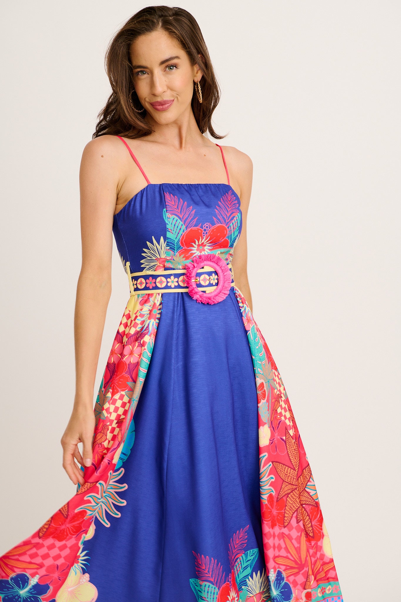 Designed with a shirred back and princess cut bodice, it offers a comfortable fit. Adjustable straps, a raffia-buckled belt and gold zipper elevate this summer standout.
