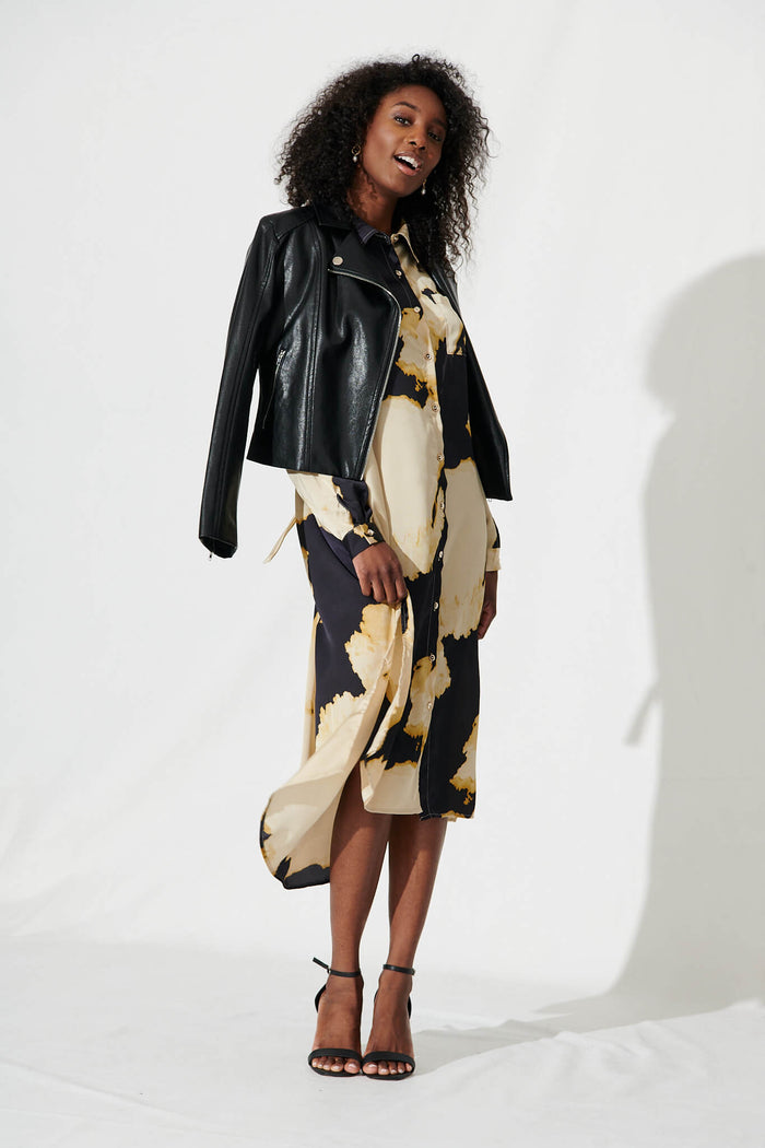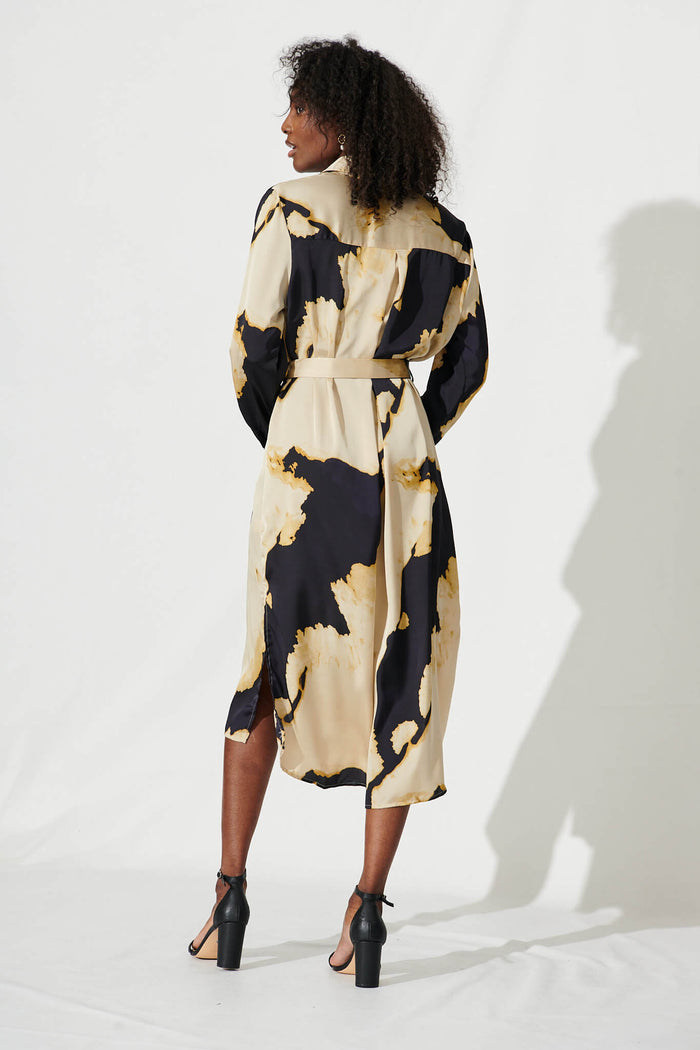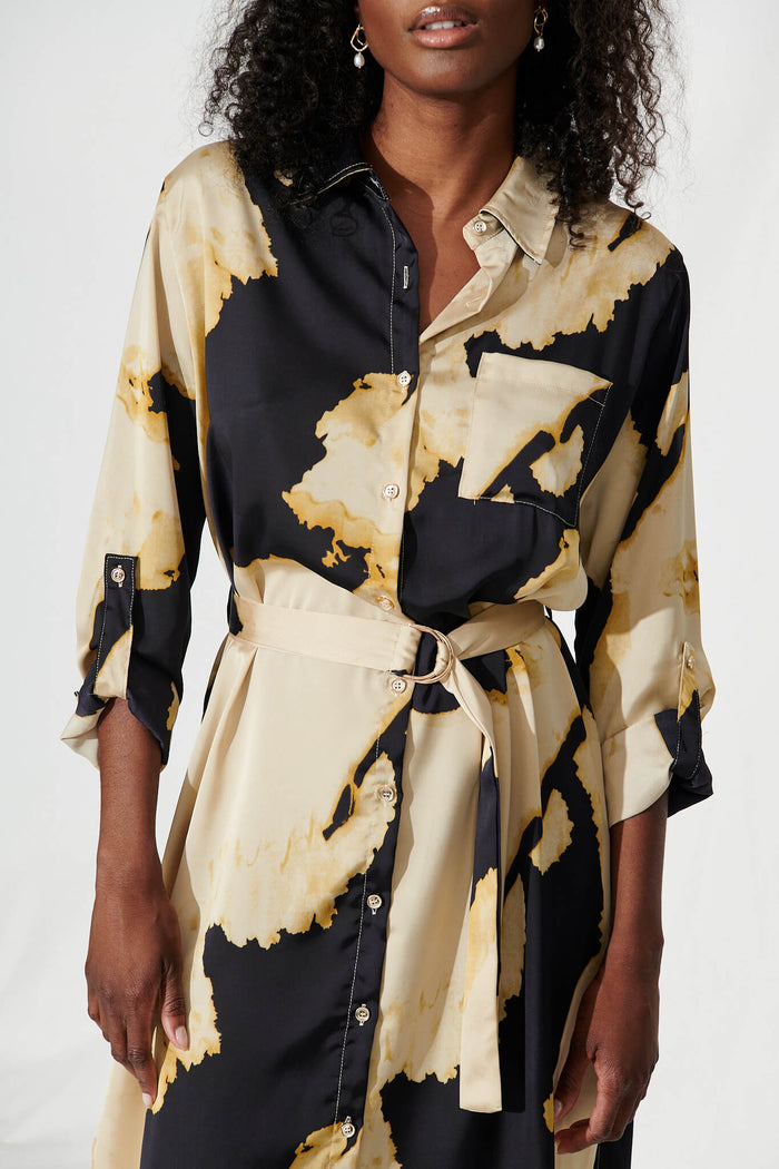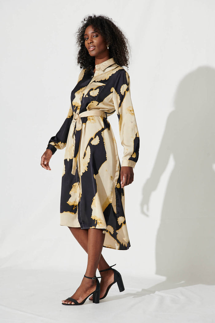 Dayside Midi Shirt Dress In Black And Champagne Satin