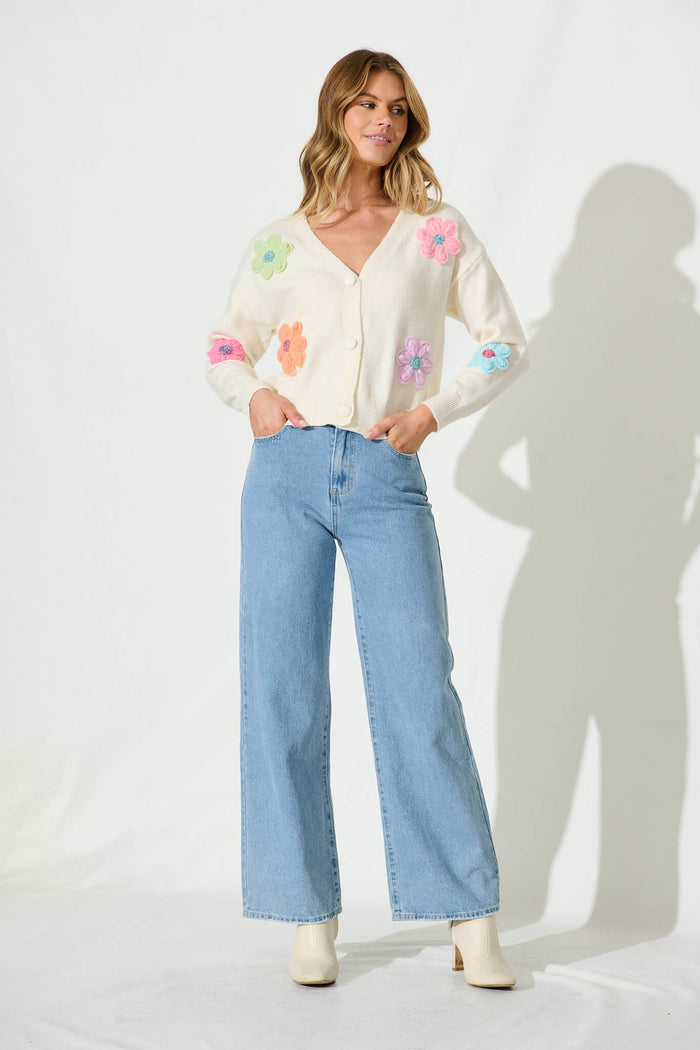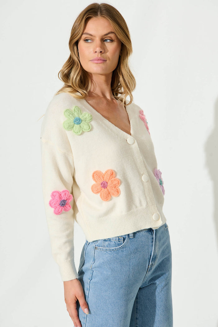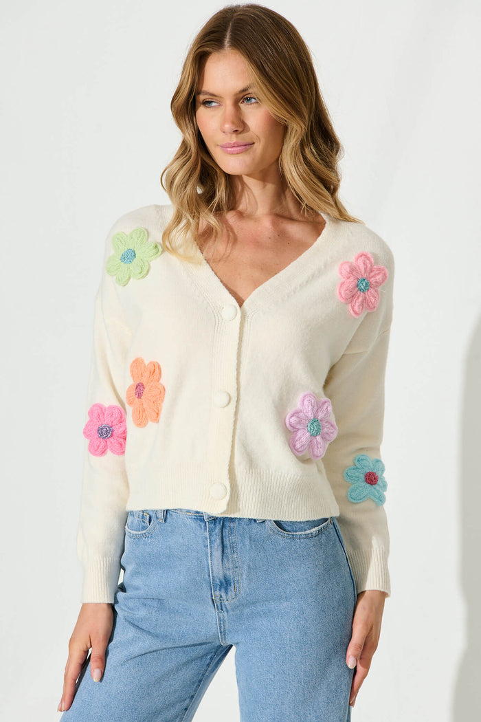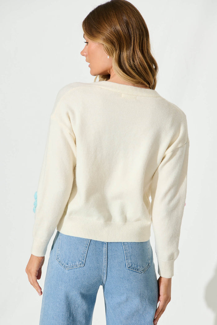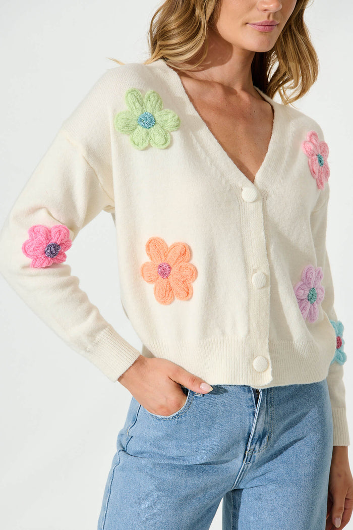 Daytales Knit Cardigan In Cream With Multi Flower Wool Blend