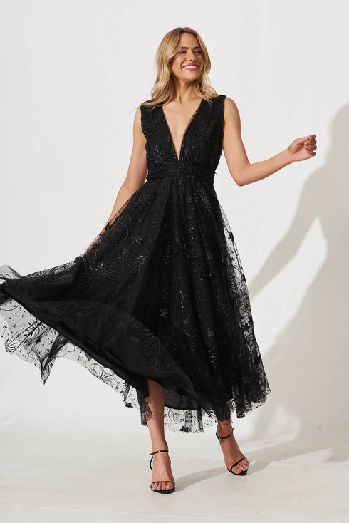 Dazzle Maxi Dress In Black Sequin Tulle