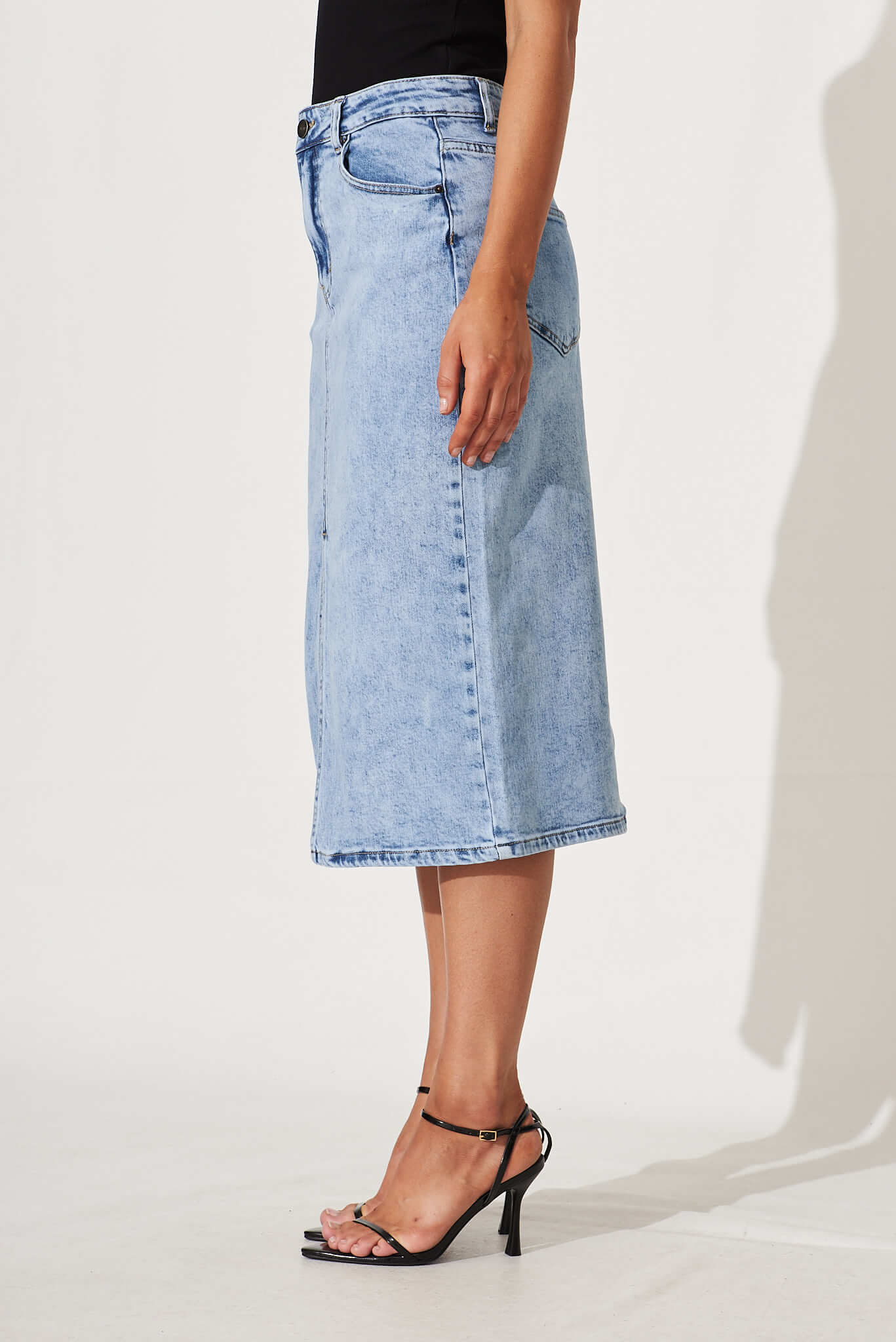 Deja Vu Midi Stretch Denim Skirt In Light Blue Wash